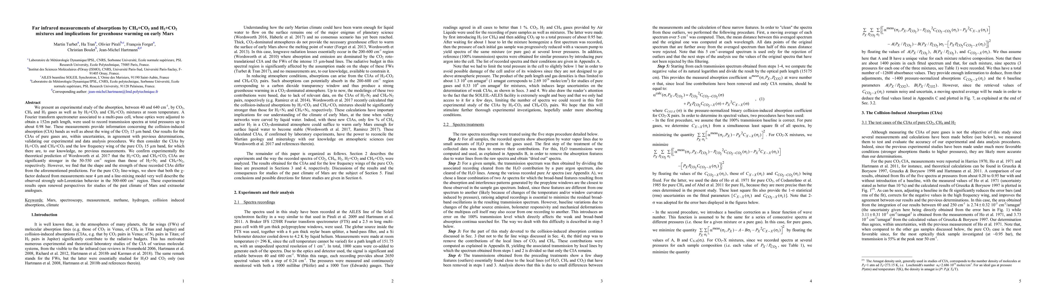 We present an experimental study of the absorption, between 40 and 640 cm$^{-1}$, by CO$_2$, CH$_4$ and H$_2$ gases as well as by H$_2$+CO$_2$ and CH$_4$+CO$_2$ mixtures at room temperature. A Fourier transform spectrometer associated to a multi-pass cell, whose optics were adjusted to obtain a 152 m pathlength, were used to record transmission spectra at total pressures up to about 0.98 bar. These measurements provide information concerning the collision-induced absorption (CIA) bands as well as about the wing of the CO$_2$ 15 $\mu$m band. Our results for the CIAs of pure gases are, within uncertainties, in agreement with previous determinations, validating our experimental and data analysis procedures. We then consider the CIAs by H$_2$+CO$_2$ and CH$_4$+CO$_2$ and the low frequency wing of the pure CO$_2$ 15 $\mu$m band, for which there are, to our knowledge, no previous measurements. We confirm experimentally the theoretical prediction of Wordsworth et al. 2017 that the H$_2$+CO$_2$ and CH$_4$+CO$_2$ CIAs are significantly stronger in the 50-550 cm$^{-1}$ region than those of H$_2$+N$_2$ and CH$_4$+N$_2$, respectively. However, we find that the shape and the strength of these recorded CIAs differ from the aforementioned predictions. For the pure CO$_2$ line-wings, we show that both the $\chi$-factor deduced from measurements near 4 $\mu$m and a line-mixing model very well describe the observed strongly sub-Lorentzian behavior in the 500-600 cm$^{-1}$ region. These experimental results open renewed perspectives for studies of the past climate of Mars and extrasolar analogues.
