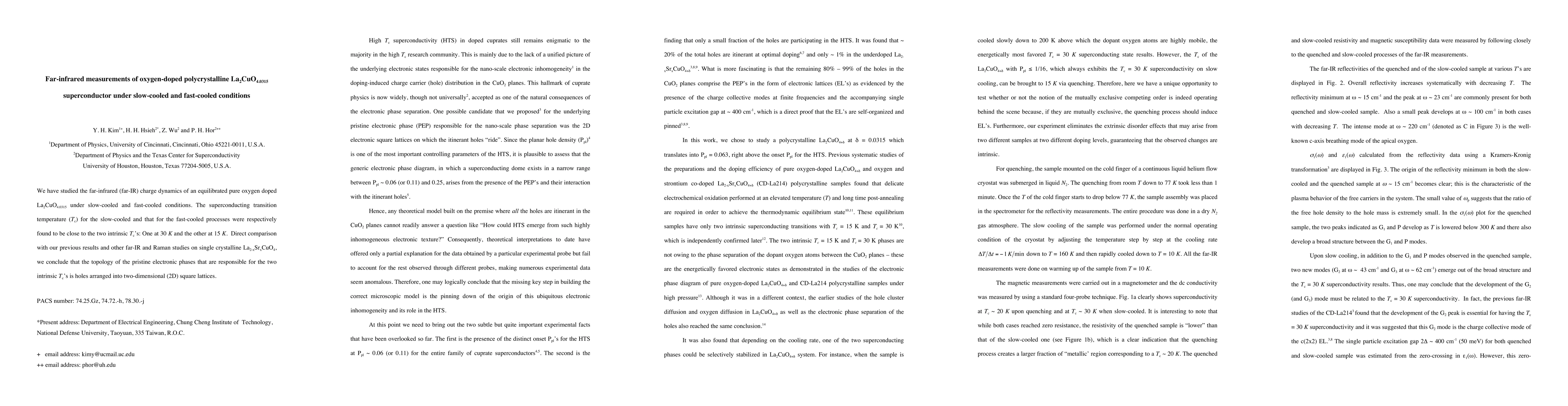 This study examines far-infrared charge dynamics in oxygen-doped La2CuO4.0315 superconductor, cooled either slowly or quickly. Results indicate two intrinsic Tc values at 30K and 15K for both cooling conditions, suggesting that the fundamental electronic phases responsible for superconductivity are 2D square lattice hole arrangements.