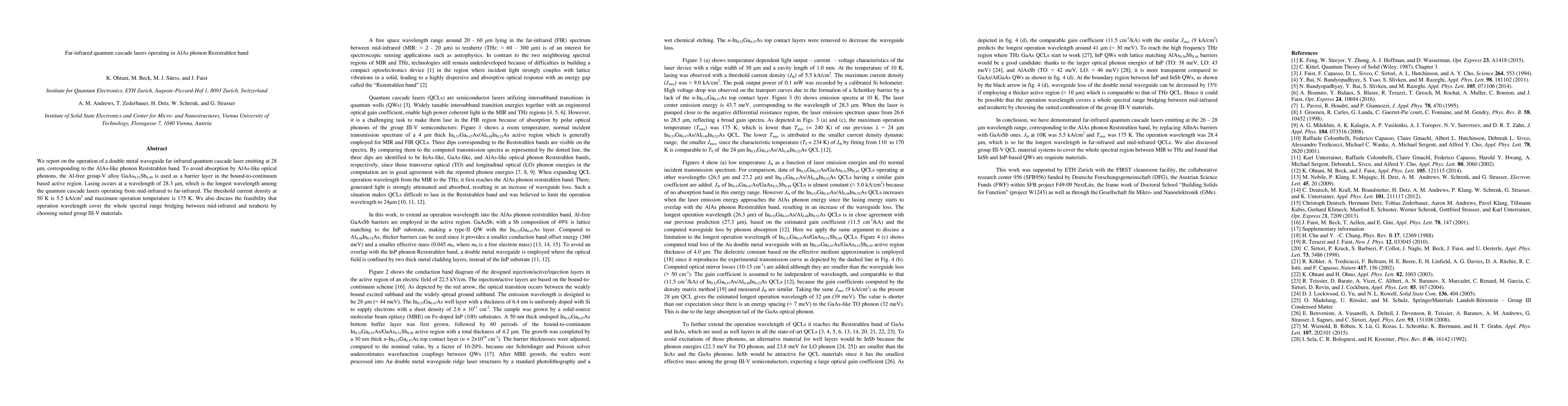 We report on the operation of a double metal waveguide far-infrared quantum cascade laser emitting at 28 $\mu$m, corresponding to the AlAs-like phonon Reststrahlen band. To avoid absorption by AlAs-like optical phonons, the Al-free group-V alloy GaAs$_{0.51}$Sb$_{0.49}$ is used as a barrier layer in the bound-to-continuum based active region. Lasing occurs at a wavelength of 28.3 $\mu$m, which is the longest wavelength among the quantum cascade lasers operating from mid-infrared to far-infrared. The threshold current density at 50 K is 5.5 kA/cm$^{2}$ and maximum operation temperature is 175 K. We also discuss the feasibility that operation wavelength cover the whole spectral range bridging between mid-infrared and terahertz by choosing suited group III-V materials.