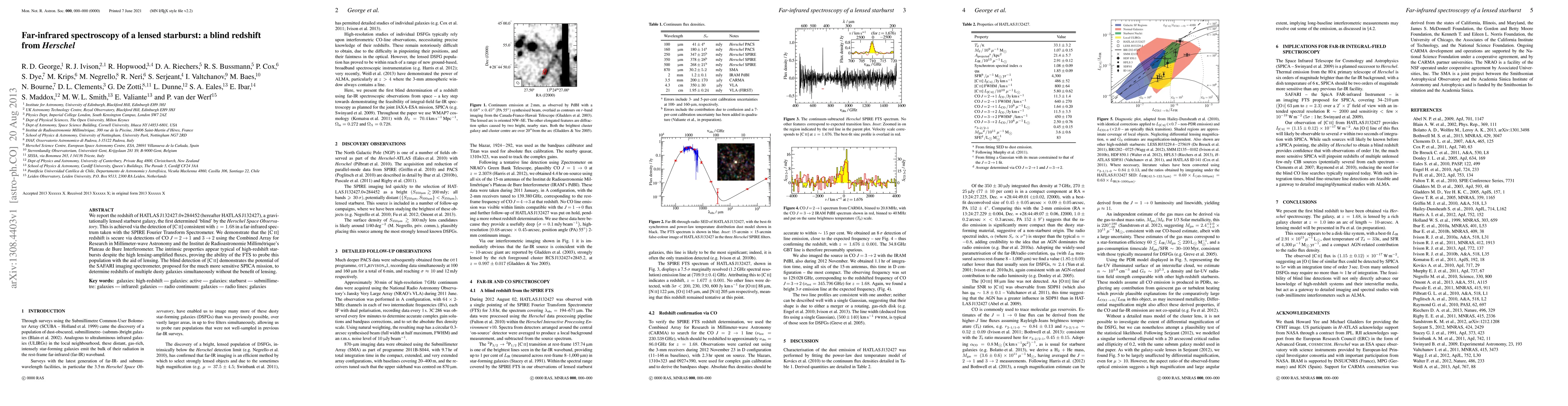 This paper reports the first blind redshift determination of a gravitationally lensed starburst galaxy, HATLAS J132427, using the Herschel Space Observatory's SPIRE spectrometer. The redshift of z = 1.68 was confirmed via detections of [C II], CO J = 2-1, and CO J = 3-2 lines, showcasing the potential of future SAFARI spectrometers on the SPICA mission to identify redshifts in dusty galaxies.