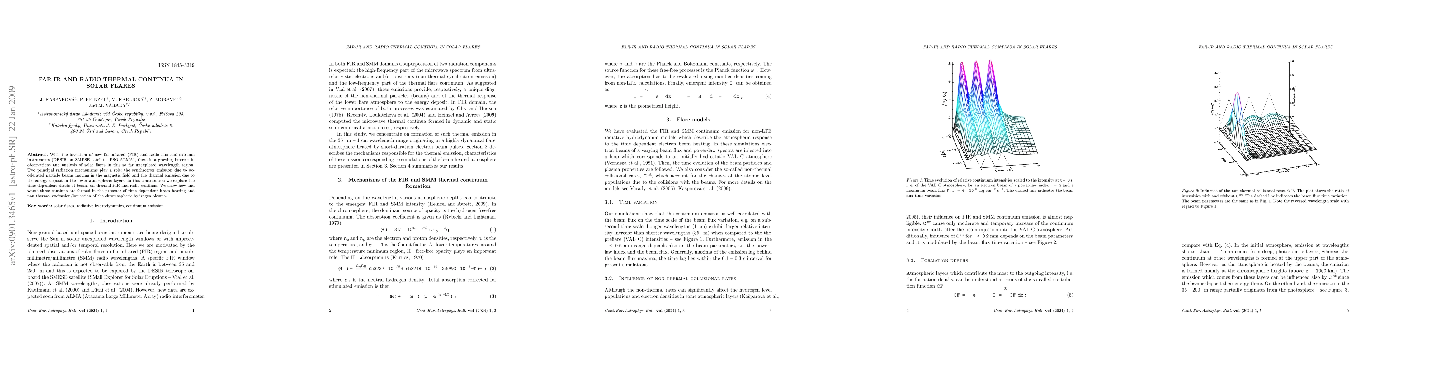 This paper investigates the thermal far-infrared and radio continua in solar flares using new instruments, focusing on synchrotron emission and thermal emission mechanisms. It examines the time-dependent effects of accelerated particle beams on the formation of these continua in the chromospheric hydrogen plasma.