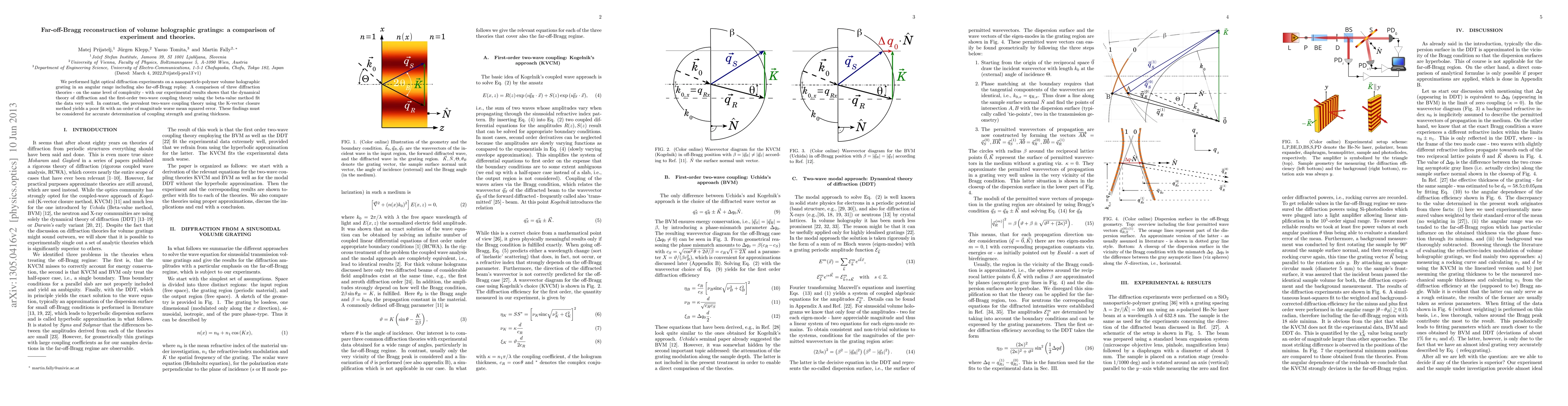 We performed light optical diffraction experiments on a nanoparticle-polymer volume holographic grating in an angular range including also far off-Bragg replay. A comparison of three diffraction theories - on the same level of complexity - with our experimental results shows that the dynamical theory of diffraction and the first-order two-wave coupling theory using the beta-value method fit the data very well. In contrast, the prevalent two-wave coupling theory using the K-vector closure method yields a poor fit with an order of magnitude worse mean squared error. These findings must be considered for accurate determination of coupling strength and grating thickness.