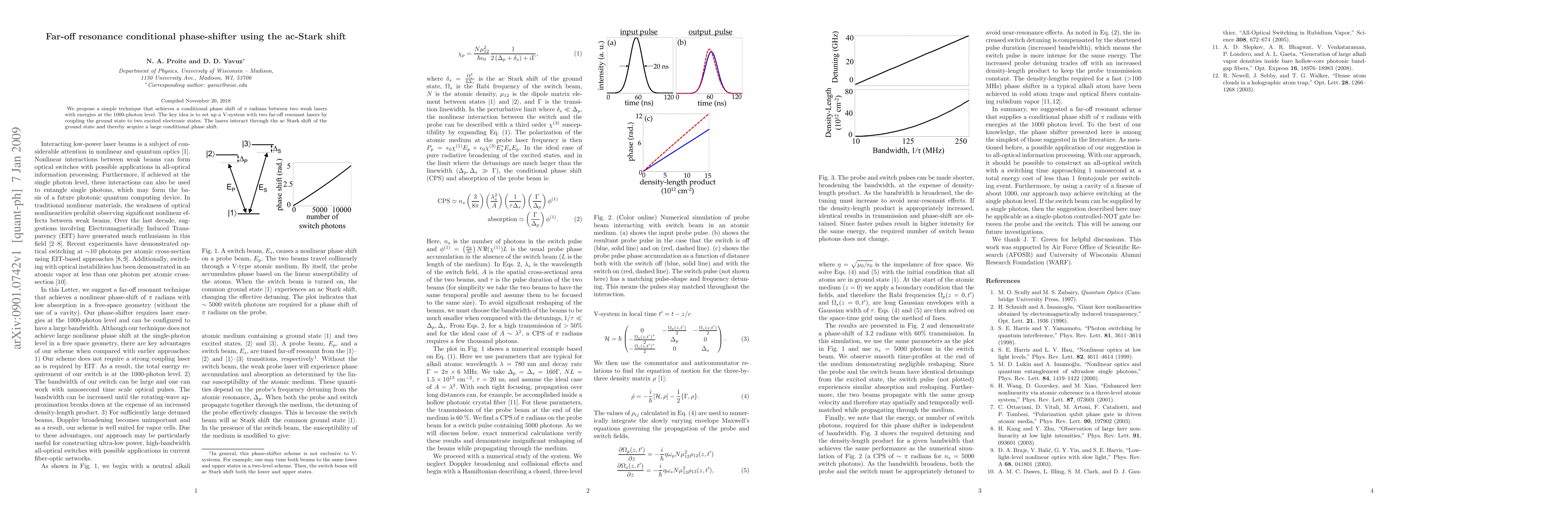 The research proposes a technique using a V-system with two far-off resonant lasers to achieve a conditional phase shift of pi radians between two weak lasers at the 1000-photon level via the ac-Stark shift of the ground state.