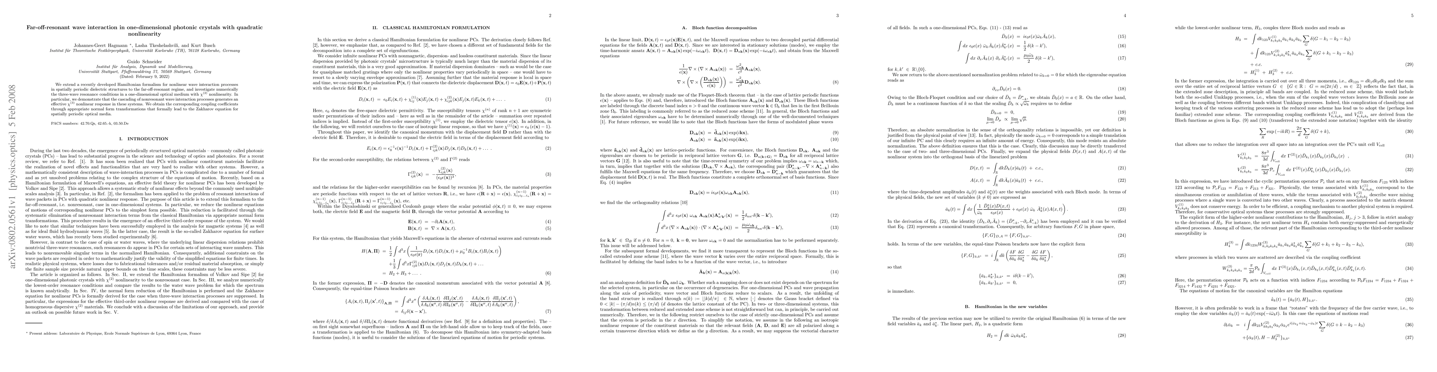 This research extends a Hamiltonian formalism to analyze nonlinear wave interactions in one-dimensional photonic crystals with quadratic nonlinearity, showing that far-off-resonant processes generate an effective cubic nonlinear response. Numerical investigations reveal the three-wave resonance conditions and coupling coefficients using normal form transformations.