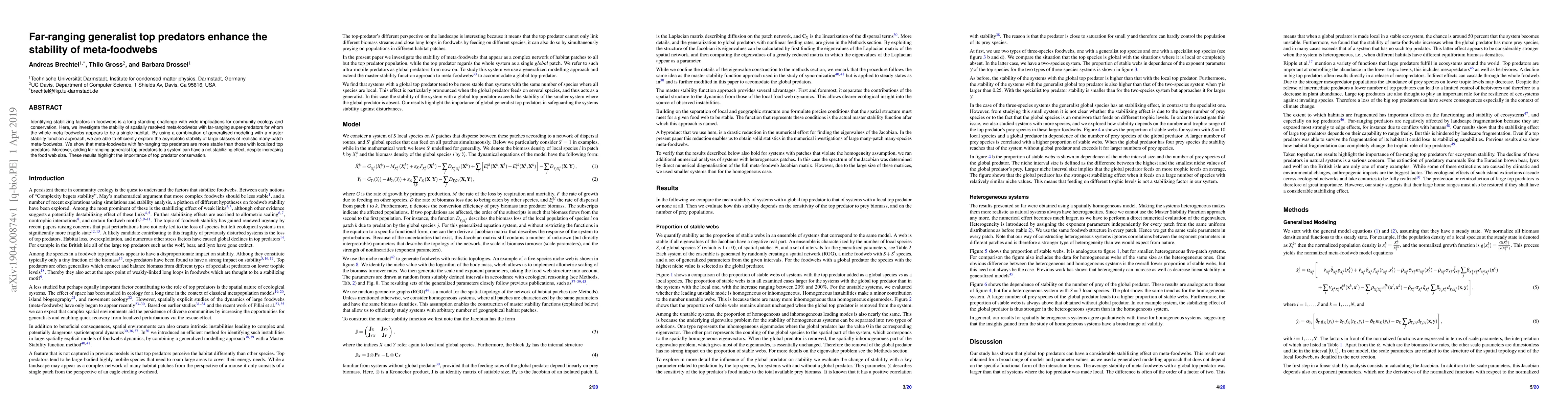 Adding far-ranging generalist top predators to a foodweb can increase stability, despite increasing its size, according to this study. This finding highlights the importance of top predator conservation for maintaining ecosystem balance.