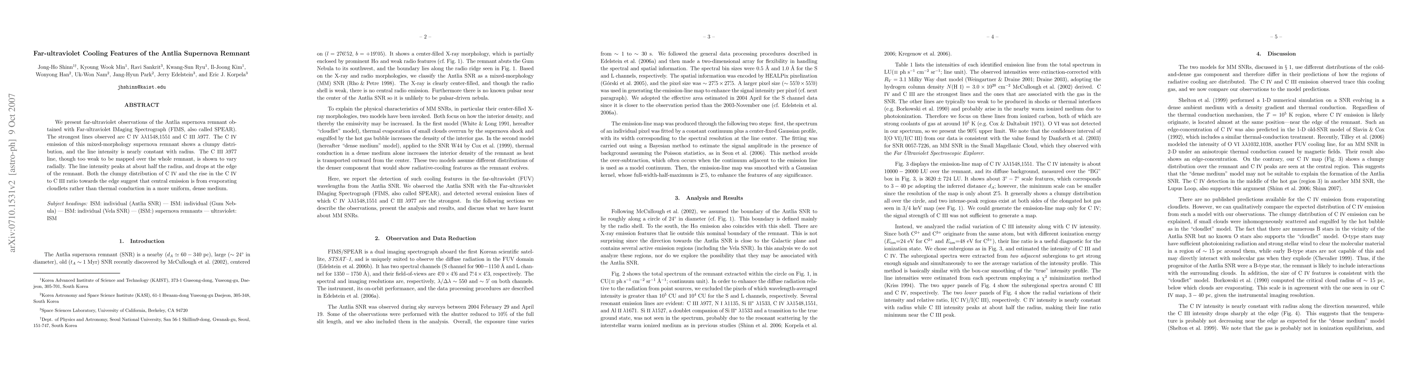 This study uses Far-ultraviolet IMaging Spectrograph (FIMS) observations to analyze the Antlia supernova remnant, revealing a clumpy distribution of C IV emission and a radial variation in C III 977 intensity. The findings suggest that central emission arises from evaporating cloudlets rather than uniform thermal conduction.
