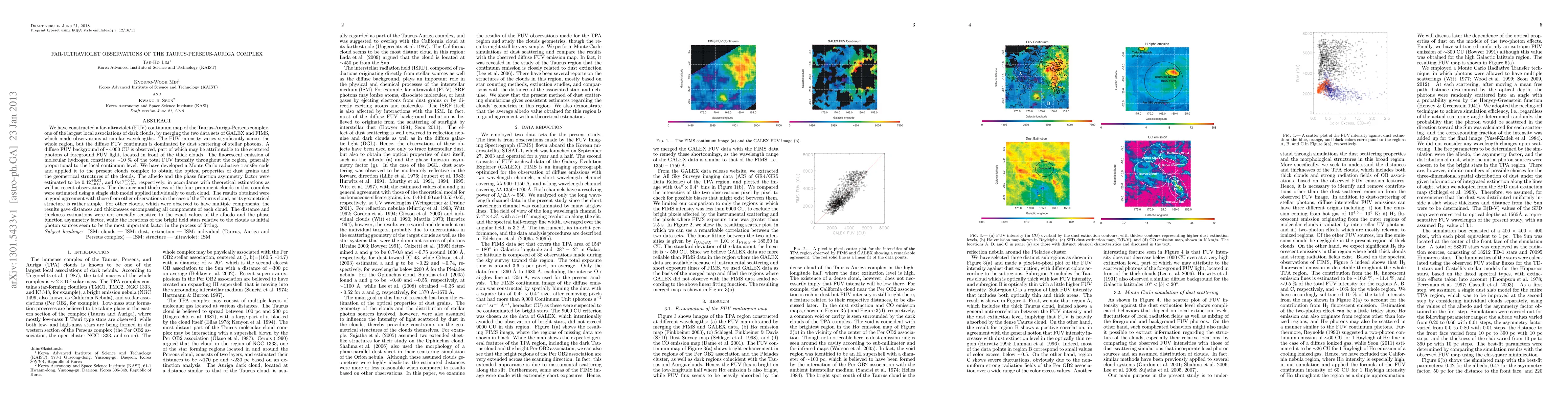 We have constructed a far-ultraviolet (FUV) continuum map of the Taurus-Auriga-Perseus complex, one of the largest local associations of dark clouds, by merging the two data sets of GALEX and FIMS, which made observations at similar wavelengths. The FUV intensity varies significantly across the whole region, but the diffuse FUV continuum is dominated by dust scattering of stellar photons. A diffuse FUV background of $\sim$1000 CU is observed, part of which may be attributable to the scattered photons of foreground FUV light, located in front of the thick clouds. The fluorescent emission of molecular hydrogen constitutes $\sim$10% of the total FUV intensity throughout the region, generally proportional to the local continuum level. We have developed a Monte Carlo radiative transfer code and applied it to the present clouds complex to obtain the optical properties of dust grains and the geometrical structures of the clouds. The albedo and the phase function asymmetry factor were estimated to be $0.42^{+0.05}_{-0.05}$, and $0.47^{+0.11}_{-0.27}$, respectively, in accordance with theoretical estimations as well as recent observations. The distance and thickness of the four prominent clouds in this complex were estimated using a single slab model applied individually to each cloud. The results obtained were in good agreement with those from other observations in the case of the Taurus cloud, as its geometrical structure is rather simple. For other clouds, which were observed to have multiple components, the results gave distances and thicknesses encompassing all components of each cloud. The distance and thickness estimations were not crucially sensitive to the exact values of the albedo and the phase function asymmetry factor, while the locations of the bright field stars relative to the clouds as initial photon sources seem to be the most important factor in the process of fitting.