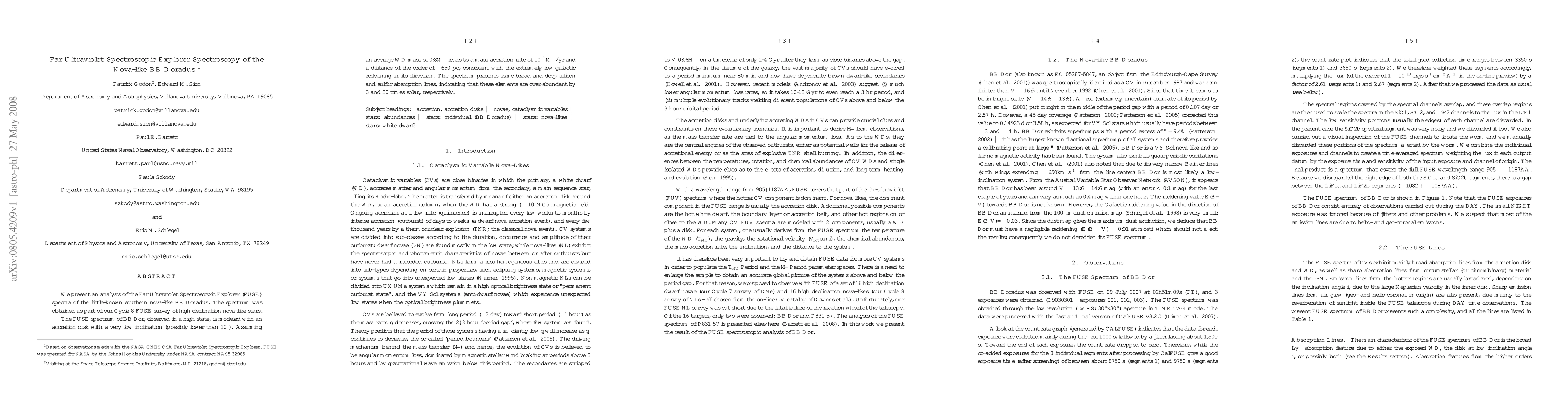 This study analyzes FUSE spectra of the nova-like BB Doradus, revealing an accretion disk with a low inclination and a mass accretion rate of 1.E-9 Solar mass/year. The spectrum shows significant over-abundances of silicon and sulfur, by 3 and 20 times solar, respectively.