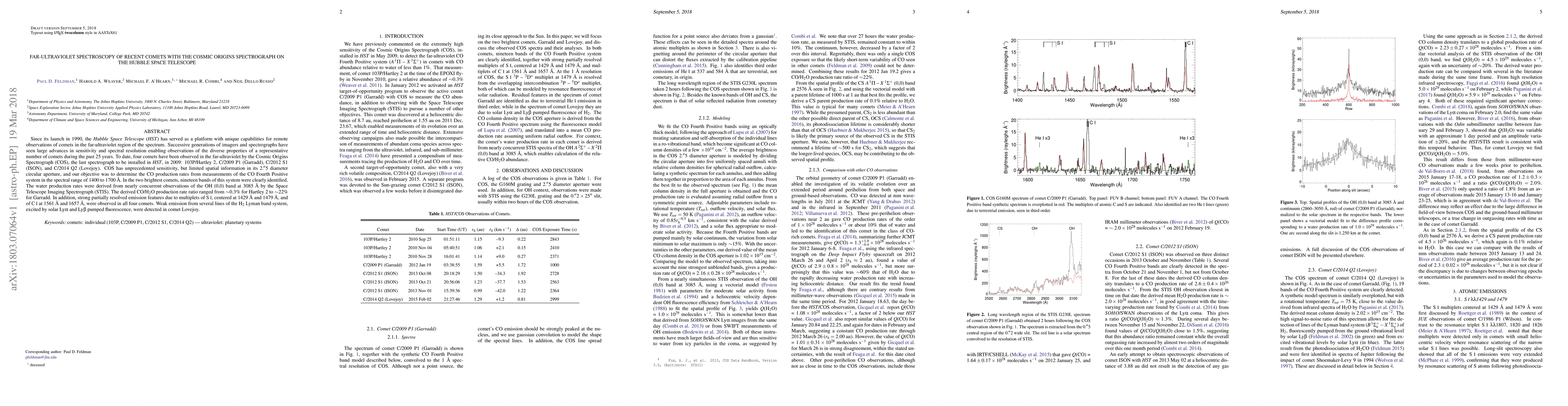 This study uses the Cosmic Origins Spectrograph on the Hubble Space Telescope to observe four recent comets in the far-ultraviolet spectrum, determining CO production rates and finding CO/H2O ratios ranging from ~0.3% to ~22%. It also identifies emission features from sulfur, carbon, and hydrogen molecules in the comets.