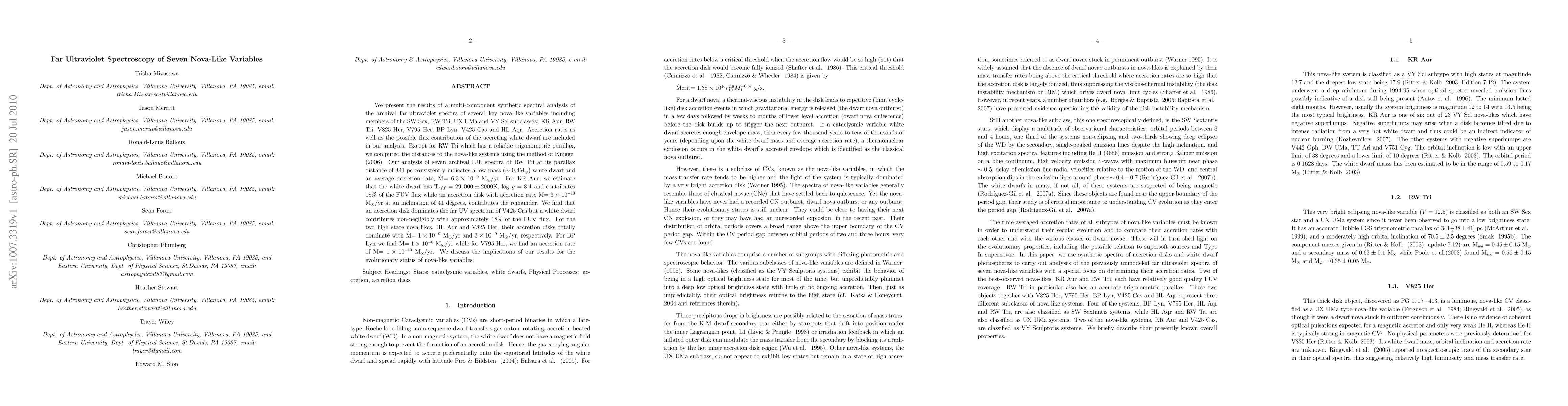 This study analyzes the far ultraviolet spectra of seven nova-like variables, determining accretion rates and contributions from accreting white dwarfs. The analysis reveals varying degrees of white dwarf and accretion disk contributions, with significant implications for the evolutionary status of these objects.