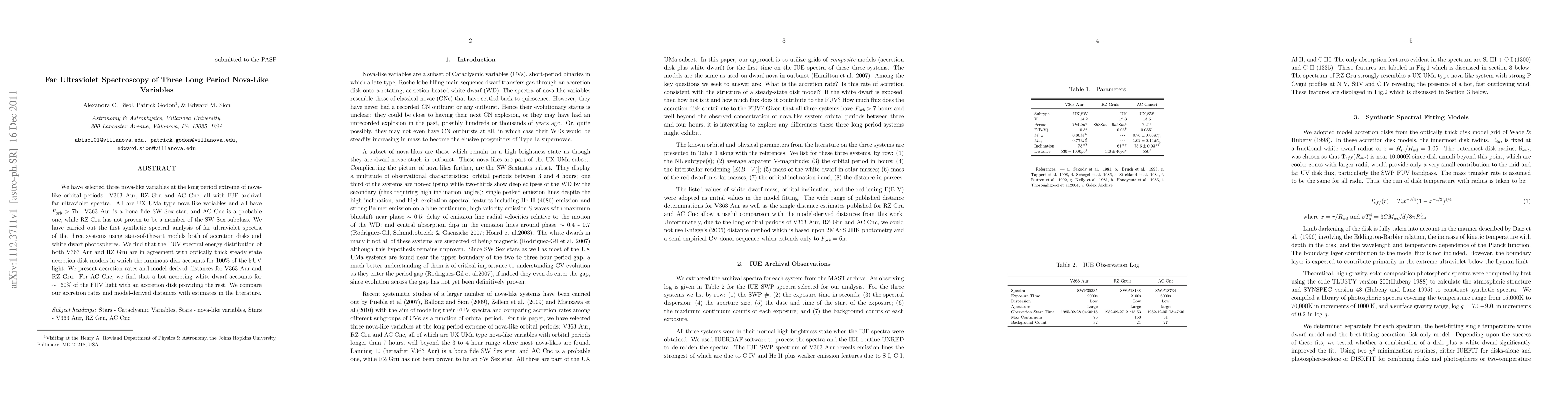 This paper conducts a synthetic spectral analysis of far ultraviolet spectra for three long period nova-like variables, finding that V363 Aur and RZ Gru's FUV light is fully explained by optically thick accretion disks, while AC Cnc's FUV light is split between a hot white dwarf and an accretion disk.