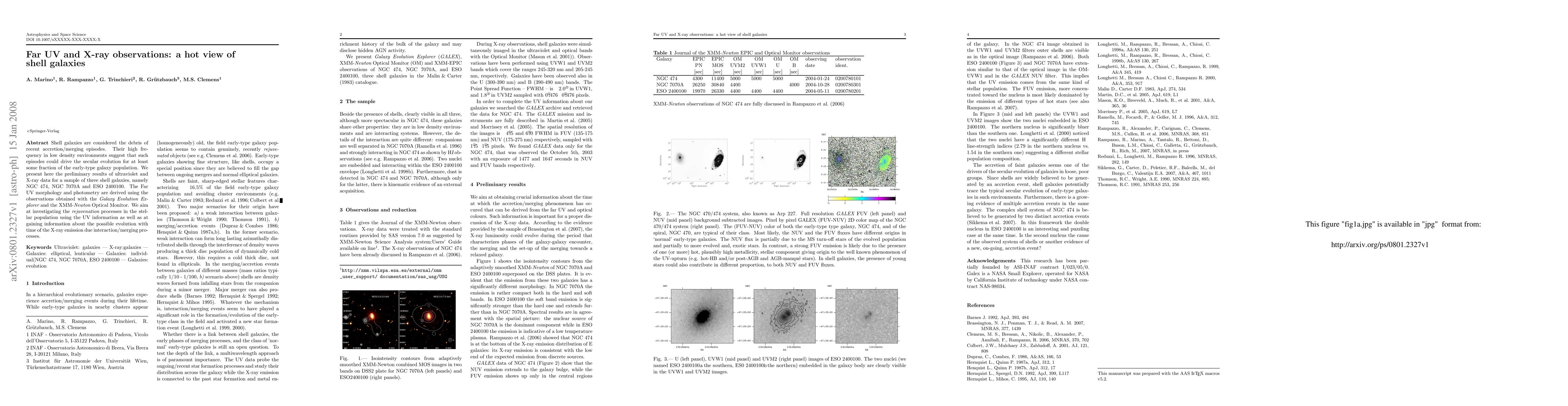 Shell galaxies are considered the debris of recent accretion/merging episodes. Their high frequency in low density environments suggest that such episodes could drive the secular evolution for at least some fraction of the early-type galaxy population. We present here the preliminary results of ultraviolet and X-ray data for a sample of three shell galaxies, namely NGC 474, NGC 7070A and ESO 2400100. The Far UV morphology and photometry are derived using the observations obtained with the Galaxy Evolution Explorer and the XMM- Newton Optical Monitor. We aim at investigating the rejuvenation processes in the stellar population using the UV information as well as at gaining information about the possible evolution with time of the X-ray emission due interaction/merging processes.