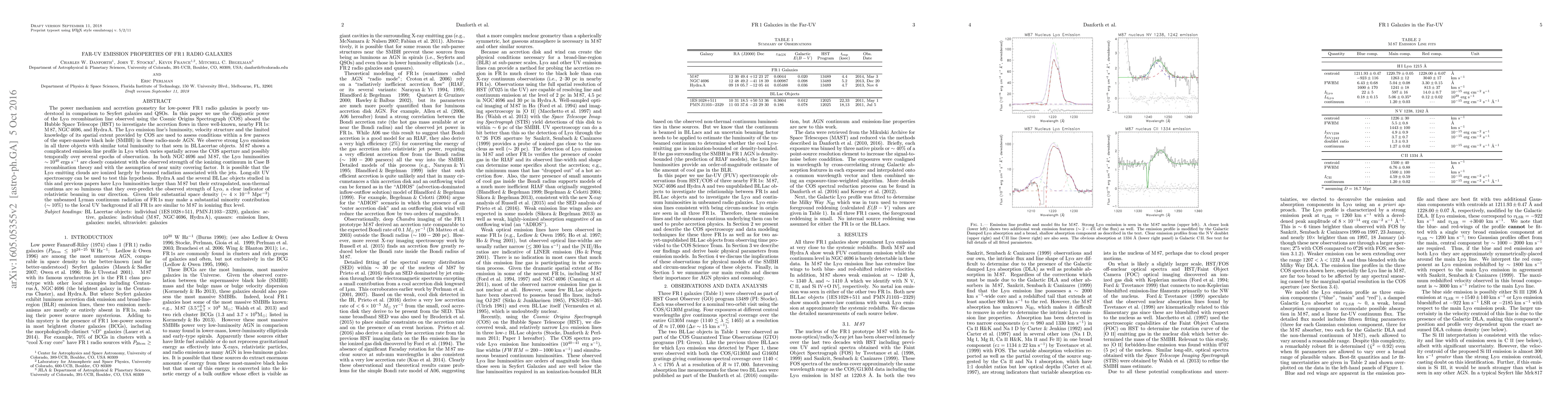 The power mechanism and accretion geometry for low-power FR1 radio galaxies is poorly understood in comparison to Seyfert galaxies and QSOs. In this paper we use the diagnostic power of the Lya recombination line observed using the Cosmic Origins Spectrograph (COS) aboard the Hubble Space Telescope (HST) to investigate the accretion flows in three well-known, nearby FR1s: M87, NGC4696, and HydraA. The Ly$\alpha$ emission line's luminosity, velocity structure and the limited knowledge of its spatial extent provided by COS are used to assess conditions within a few parsecs of the super-massive black hole (SMBH) in these radio-mode AGN. We observe strong Ly$\alpha$ emission in all three objects with similar total luminosity to that seen in BL Lacertae objects. M87 shows a complicated emission line profile in Lya which varies spatially across the COS aperture and possibly temporally over several epochs of observation. In both NGC 4696 and M87, the Ly$\alpha$ luminosities $\sim 10^{40}$ ergs/s are closely consistent with the observed strength of the ionizing continuum in Case B recombination theory and with the assumption of near unity covering factor. It is possible that the Ly$\alpha$ emitting clouds are ionized largely by beamed radiation associated with the jets. Long-slit UV spectroscopy can be used to test this hypothesis. Hydra A and the several BL Lac objects studied in this and previous papers have Lya luminosities larger than M87 but their extrapolated, non-thermal continua are so luminous that they over-predict the observed strength of Ly$\alpha$, a clear indicator of relativistic beaming in our direction. Given their substantial space density ($\sim 4\times10^{-3} Mpc^{-3}$) the unbeamed Lyman continuum radiation of FR1s may make a substantial minority contribution (~10%) to the local UV background if all FR1s are similar to M87 in ionizing flux level.