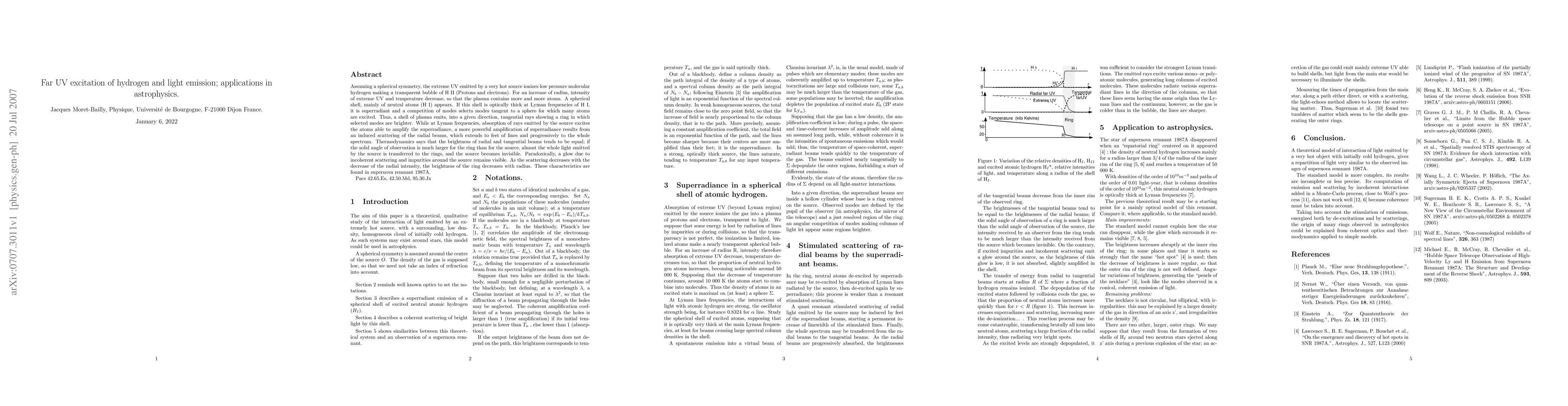 Assuming a spherical symmetry, the extreme UV emitted by a very hot source ionizes low pressure molecular hydrogen making a transparent bubble of H II (Protons and electrons). For an increase of radius, intensity of extreme UV and temperature decrease, so that the plasma contains more and more atoms. A spherical shell, mainly of neutral atoms (H I) appears. If this shell is optically thick at Lyman frequencies of H I, it is superradiant and a competition of modes selects modes tangent to a sphere for which many atoms are excited. Thus, a shell of plasma emits, into a given direction, tangential rays showing a ring in which selected modes are brighter. While at Lyman frequencies, absorption of rays emitted by the source excites the atoms able to amplify the superradiance, a more powerful amplification of superradiance results from an induced scattering of the radial beams, which extends to feet of lines and progressively to the whole spectrum. Thermodynamics says that the brightness of radial and tangential beams tends to be equal; if the solid angle of observation is much larger for the ring than for the source, almost the whole light emitted by the source is transferred to the rings, and the source becomes invisible. Paradoxically, a glow due to incoherent scattering and impurities around the source remains visible. As the scattering decreases with the decrease of the radial intensity, the brightness of the ring decreases with radius. These characteristics are found in supernova remnant 1987A.
