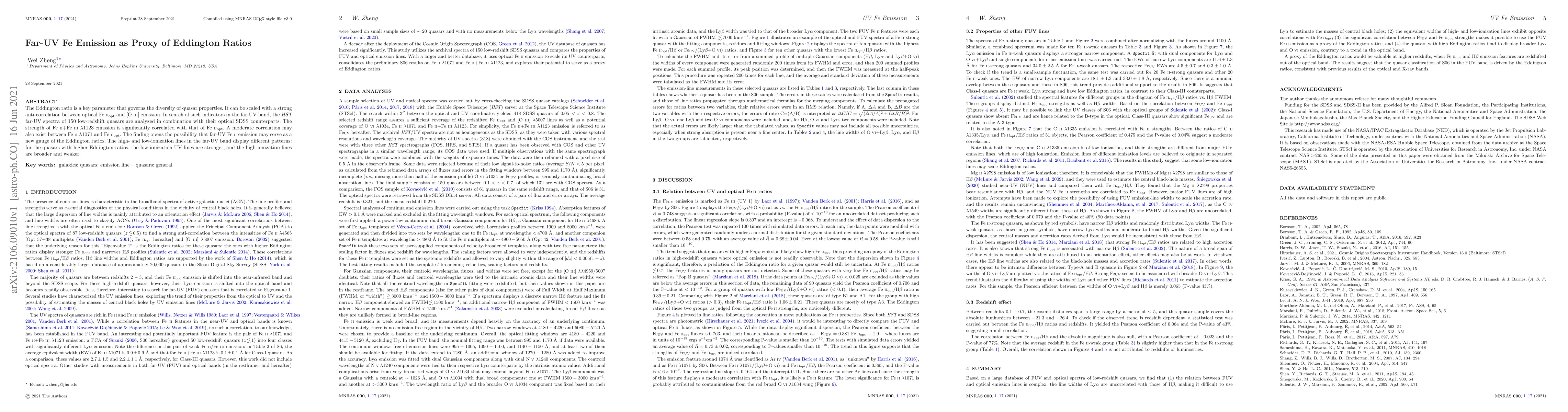 This research investigates the correlation between far-UV Fe emission and Eddington ratios in quasars, finding that far-UV Fe II emission correlates strongly with optical Fe II, suggesting it may serve as a proxy for these ratios. High- and low-ionization UV lines exhibit distinct patterns based on Eddington ratios, indicating different physical processes at play.