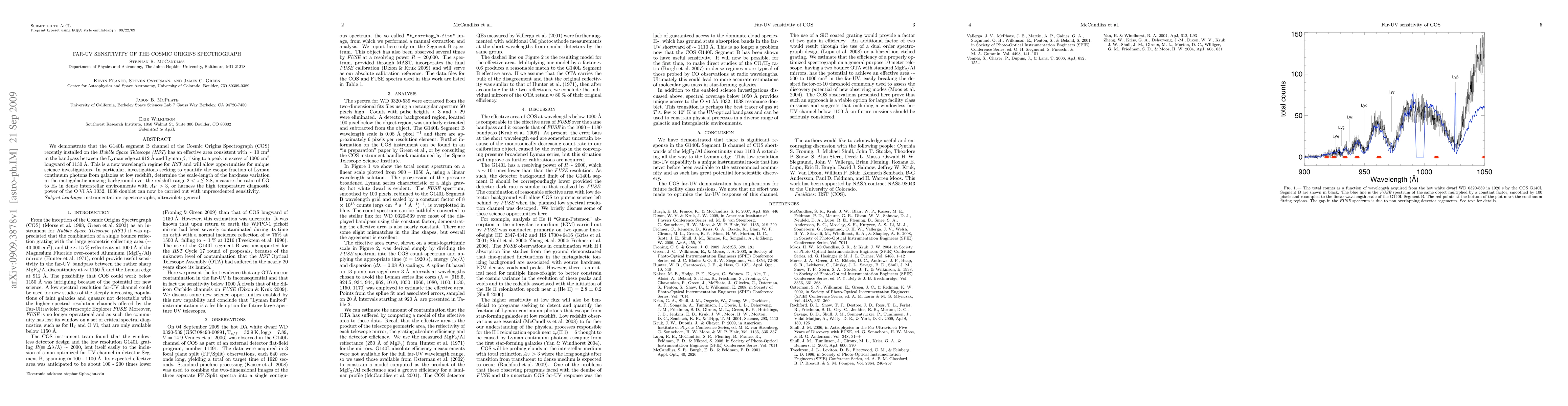We demonstrate that the G140L segment B channel of the Cosmic Origins Spectrograph (COS) recently installed on the {\it Hubble Space Telescope (HST)} has an effective area consistent with $\sim$ 10 cm$^2$ in the bandpass between the Lyman edge at 912 \AA and Lyman $\beta$, rising to a peak in excess of 1000 cm$^2$ longward of 1130 \AA. This is a new wavelength regime for {\it HST} and will allow opportunities for unique science investigations. In particular, investigations seeking to quantify the escape fraction of Lyman continuum photons from galaxies at low redshift, determine the scale-length of the hardness variation in the metagalactic ionizing background over the redshift range 2 $< z \lesssim$ 2.8, measure the ratio of CO to H$_2$ in dense interstellar environments with $A_V >$ 3, or harness the high temperature diagnostic power of the \ion{O}{6} $\lambda\lambda$ 1032, 1038 doublet can now be carried out with unprecedented sensitivity.