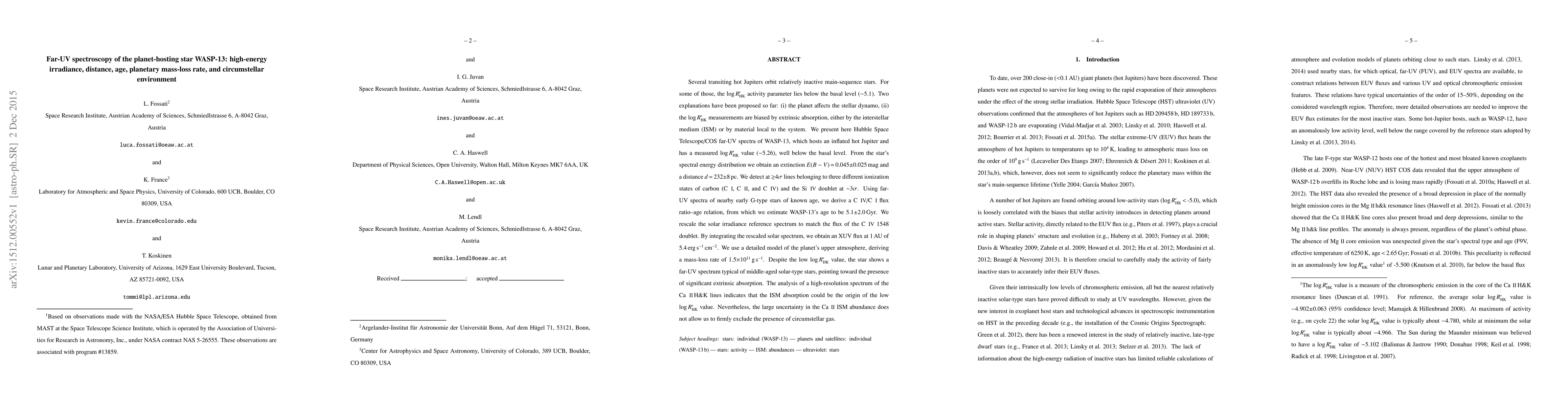 Several transiting hot Jupiters orbit relatively inactive main-sequence stars. For some of those, the logR'HK activity parameter lies below the basal level (-5.1). Two explanations have been proposed so far: (i) the planet affects the stellar dynamo, (ii) the logR'HK measurements are biased by extrinsic absorption, either by the interstellar medium (ISM) or by material local to the system. We present here Hubble Space Telescope/COS far-UV spectra of WASP-13, which hosts an inflated hot Jupiter and has a measured logR'HK value (-5.26), well below the basal level. From the star's spectral energy distribution we obtain an extinction E(B-V) = 0.045+/-0.025 mag and a distance d = 232+/-8 pc. We detect at >4 sigma lines belonging to three different ionization states of carbon (C1, C2, and C4) and the Si4 doublet at ~3 sigma. Using far-UV spectra of nearby early G-type stars of known age, we derive a C4/C1 flux ratio-age relation, from which we estimate WASP-13's age to be 5.1+/-2.0 Gyr. We rescale the solar irradiance reference spectrum to match the flux of the C4 1548 doublet. By integrating the rescaled solar spectrum, we obtain an XUV flux at 1 AU of 5.4 erg s^-1 cm^-2. We use a detailed model of the planet's upper atmosphere, deriving a mass-loss rate of 1.5x10^11 g s^-1. Despite the low logR'HK value, the star shows a far-UV spectrum typical of middle-aged solar-type stars, pointing toward the presence of significant extrinsic absorption. The analysis of a high-resolution spectrum of the Ca2H&K lines indicates that the ISM absorption could be the origin of the low logR'HK value. Nevertheless, the large uncertainty in the Ca2 ISM abundance does not allow us to firmly exclude the presence of circumstellar gas.