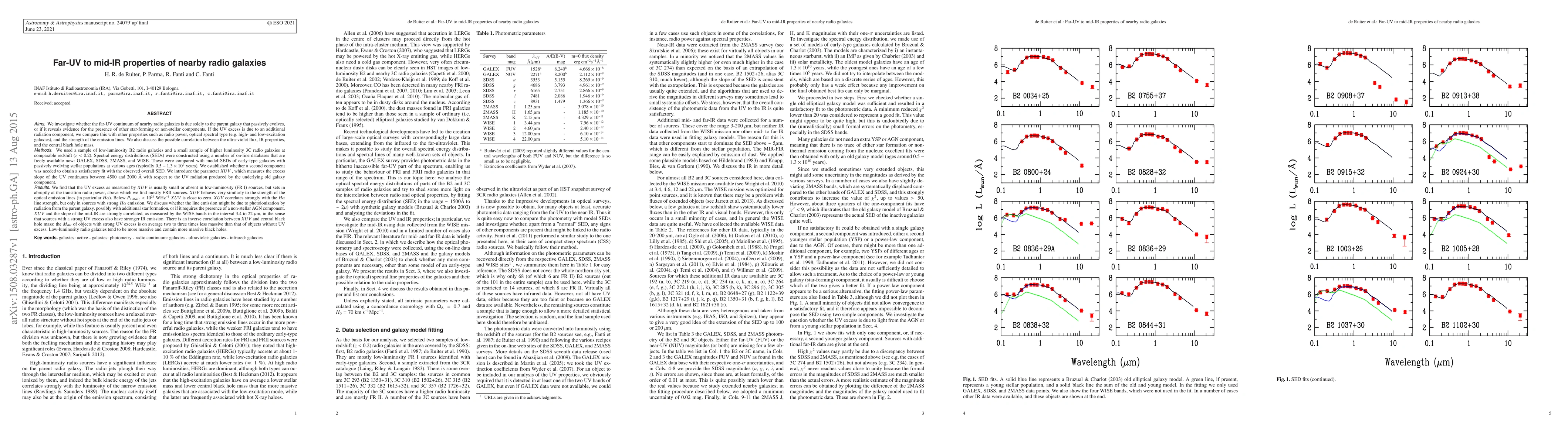 We investigate whether the far-UV continuum of nearby radio galaxies reveals evidence for the presence of star forming or non-stellar components. If a UV excess due to an extra radiation component exists we compare this with other properties such as radio power, optical spectral type and the strength of the emission lines. We also discuss the possible correlation between the ultra-violet flux, IR properties and central black hole mass. We use two sampes of low luminosity radio galaxies with comparable redshifts ($z < 0.2$). Spectral Energy Distributions are constructed using a number of on-line databases: GALEX, SDSS, 2MASS, and WISE. The parameter $XUV$ is introduced, which measures the excess slope of the UV continuum between 4500 and 2000 \AA, with respect to the UV radiation produced by the underlying old galaxy component. We find that the UV excess is usually small or absent in low luminosity sources, but sets in abruptly at the transition radio power above which we find mostly FRII sources. $XUV$ behaves very similarly to the strength of the optical emission lines (in particular $H\alpha$). Below $P_{1.4 GHz} < 10^{24}$ WHz$^{-1}$ $XUV$ is close to zero. $XUV$ correlates strongly with the $H\alpha$ line strength, but only in sources with strong $H\alpha$ emission. There is a strong correlation between $XUV$ and the slope of the mid-IR, as measured by the WISE bands in the interval 3.4 to 22 $\mu$m, in the sense that sources with a strong UV excess also have stronger IR emission. There is an inverse correlation between $XUV$ and central black hole mass: strong UV excess objects have, on average, $M_{BH}$ about 2-3 times less massive than those without UV excess. Low luminosity radio galaxies tend to be more massive and contain more massive black holes.