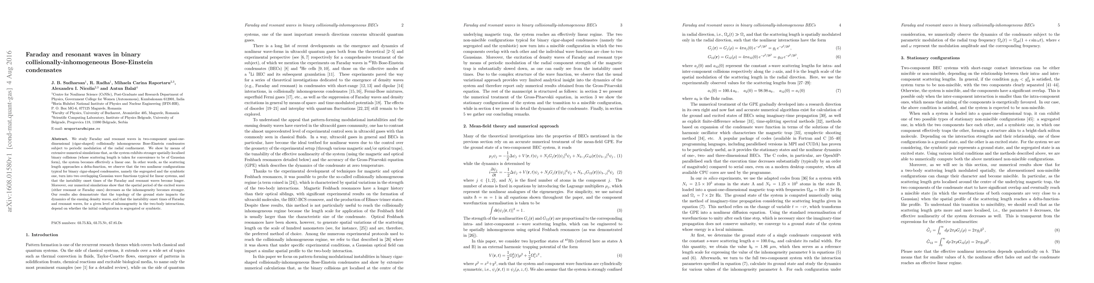 This paper investigates Faraday and resonant waves in quasi-one-dimensional, collisionally inhomogeneous Bose-Einstein condensates under periodic modulation. It finds that stronger localized binary collisions lead to linear behavior, transforming nonlinear configurations into overlapping Gaussian wave functions and increasing the onset times of instabilities.