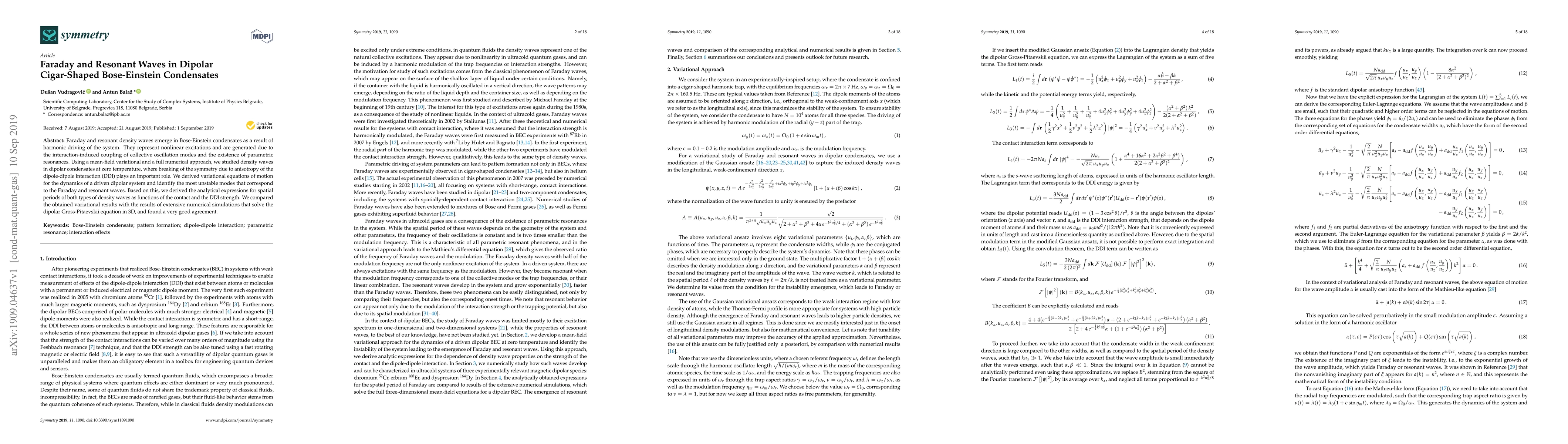 This paper investigates Faraday and resonant density waves in dipolar cigar-shaped Bose-Einstein condensates driven harmonically, revealing nonlinear excitations due to parametric resonances. Analytical and numerical methods were used to derive equations of motion and identify unstable modes, showing good agreement between the two approaches.