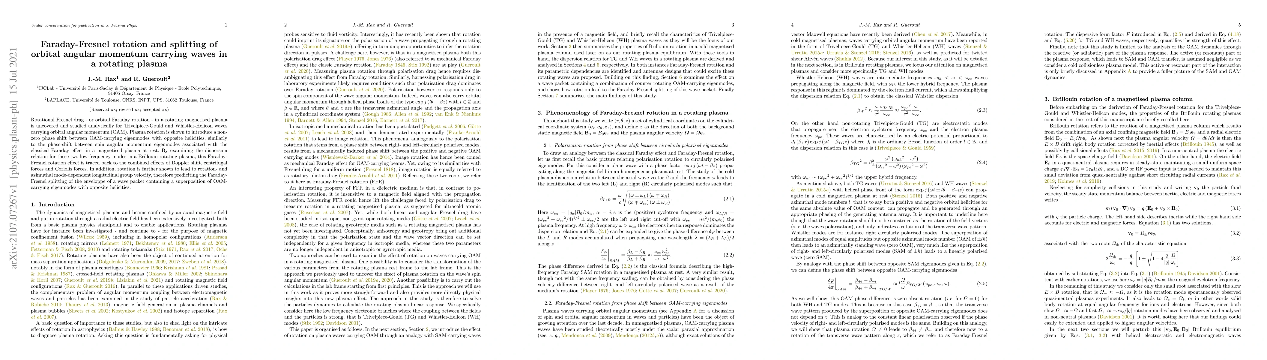 Rotational Fresnel drag - or orbital Faraday rotation - in a rotating magnetised plasma is uncovered and studied analytically for Trivelpiece-Gould and Whistler-Helicon waves carrying orbital angular momentum (OAM). Plasma rotation is shown to introduce a non-zero phase shift between OAM-carrying eigenmodes with opposite helicities, similarly to the phase-shift between spin angular momentum eigenmodes associated with the classical Faraday effect in a magnetised plasma at rest. By examining the dispersion relation for these two low-frequency modes in a Brillouin rotating plasma, this Faraday-Fresnel rotation effect is traced back to the combined effects of Doppler shift, centrifugal forces and Coriolis forces. In addition, rotation is further shown to lead to rotation- and azimuthal mode-dependent longitudinal group velocity, therefore predicting the Faraday-Fresnel splitting of the enveloppe of a wave packet containing a superposition of OAM-carrying eigenmodes with opposite helicities.