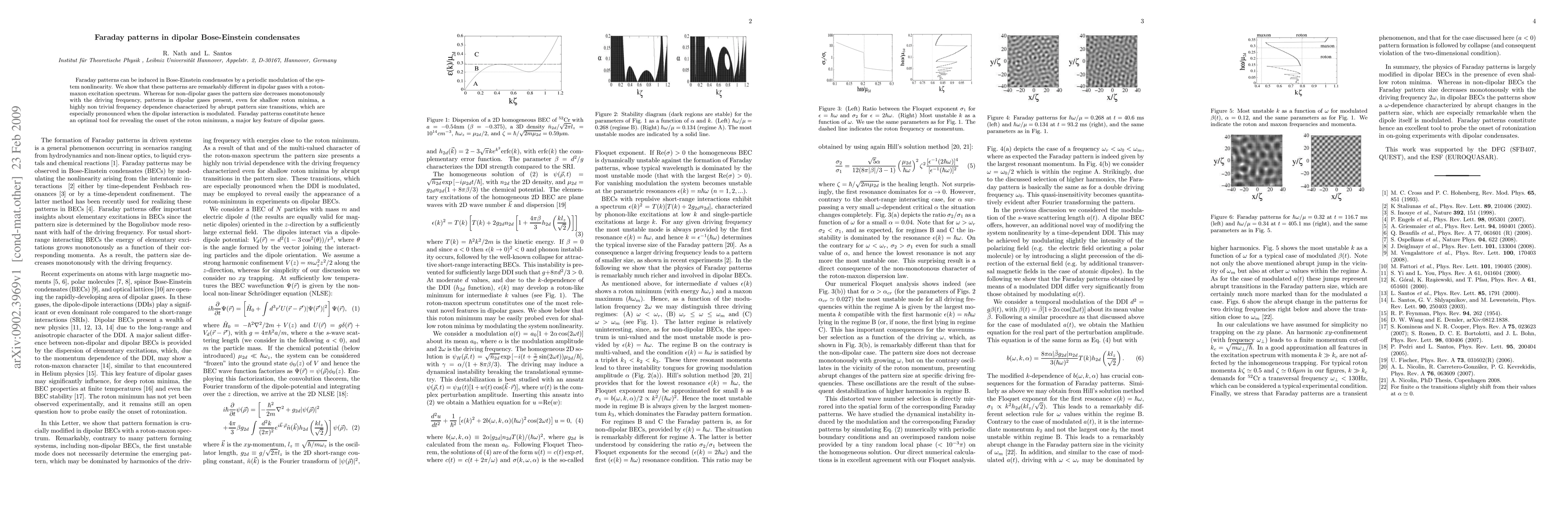 This paper investigates Faraday patterns in dipolar Bose-Einstein condensates, revealing that modulation of nonlinearity induces distinct patterns compared to non-dipolar gases. Dipolar gases exhibit complex frequency-dependent pattern size transitions, especially pronounced with modulated dipolar interactions, highlighting the onset of roton minima.