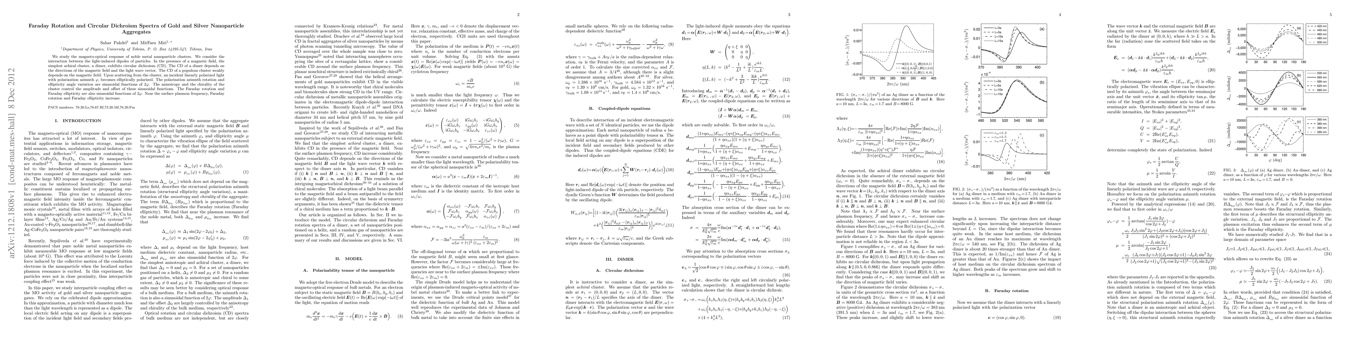 This study investigates the magneto-optical response of gold and silver nanoparticle clusters, revealing that dimer clusters exhibit circular dichroism influenced by magnetic field directions and light wave vectors. The Faraday rotation and ellipticity of scattered light are sinusoidal functions of the polarization azimuth, with their amplitude and offset controlled by the cluster's anisotropy and chirality, especially near the surface plasmon frequency.