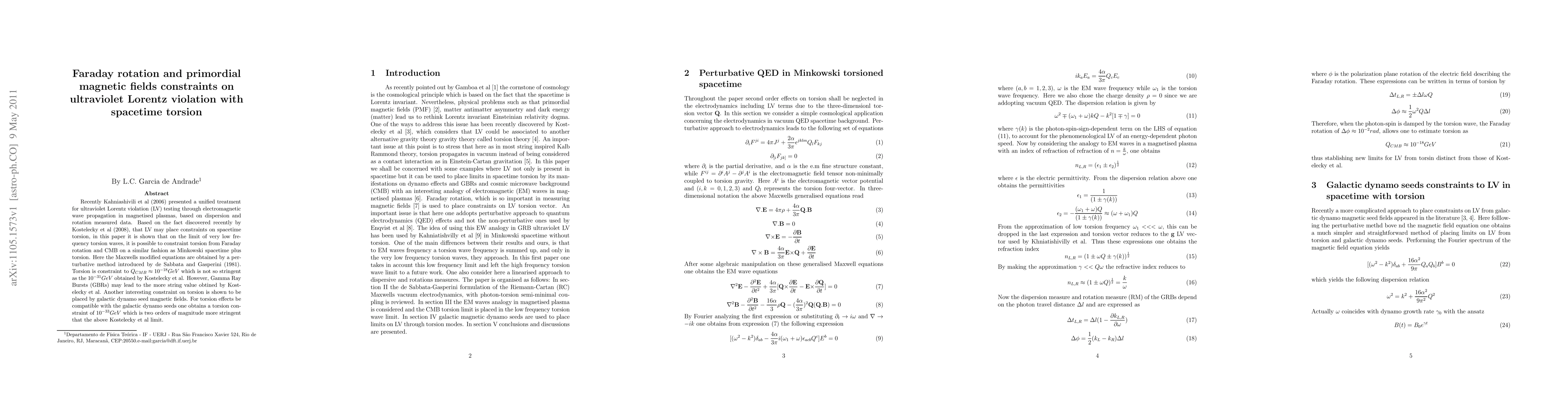 This paper investigates ultraviolet Lorentz violation (LV) in the context of spacetime torsion and its constraints derived from Faraday rotation and primordial magnetic fields. It finds that torsion is constrained to $Q_{CMB}\approx{10^{-18}GeV}$ from CMB data, but more stringent constraints of $10^{-33}GeV$ arise from galactic dynamo seed magnetic fields.