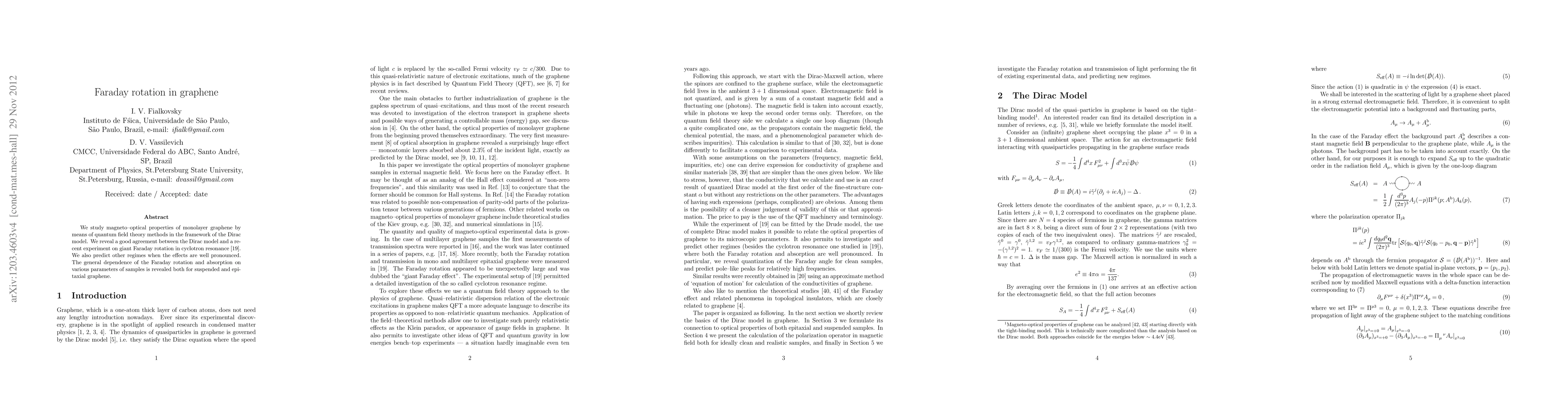 We study magneto--optical properties of monolayer graphene by means of quantum field theory methods in the framework of the Dirac model. We reveal a good agreement between the Dirac model and a recent experiment on giant Faraday rotation in cyclotron resonance. We also predict other regimes when the effects are well pronounced. The general dependence of the Faraday rotation and absorption on various parameters of samples is revealed both for suspended and epitaxial graphene.