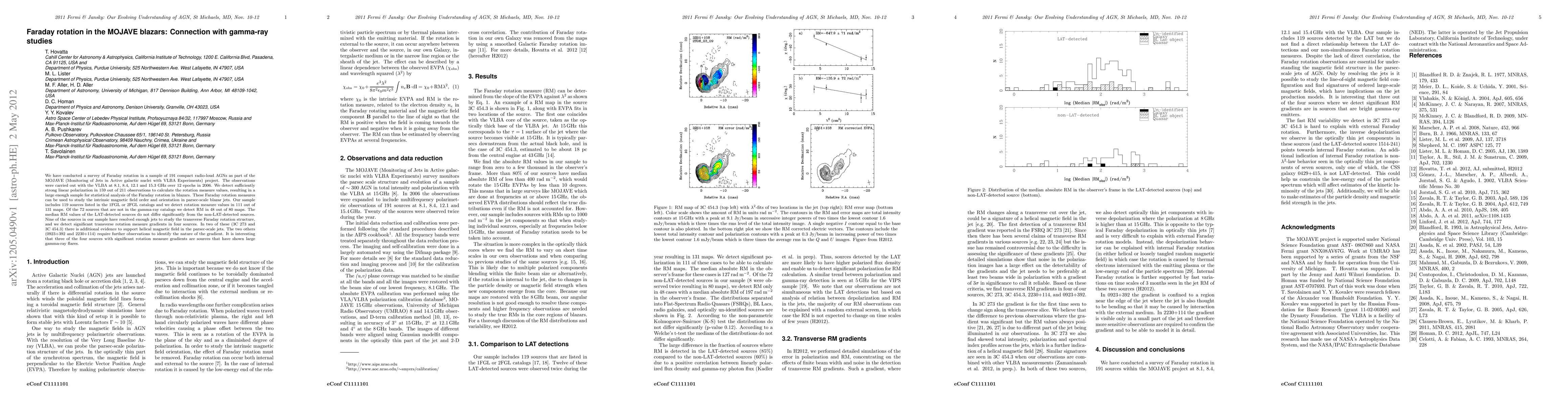 This study investigates Faraday rotation in 191 compact radio-loud AGNs using VLBA observations, finding strong linear polarization in 159 out of 211 observations. The research reveals significant transverse rotation measure gradients in four sources, suggesting helical magnetic fields in two, with three of these sources correlating with large gamma-ray flares.