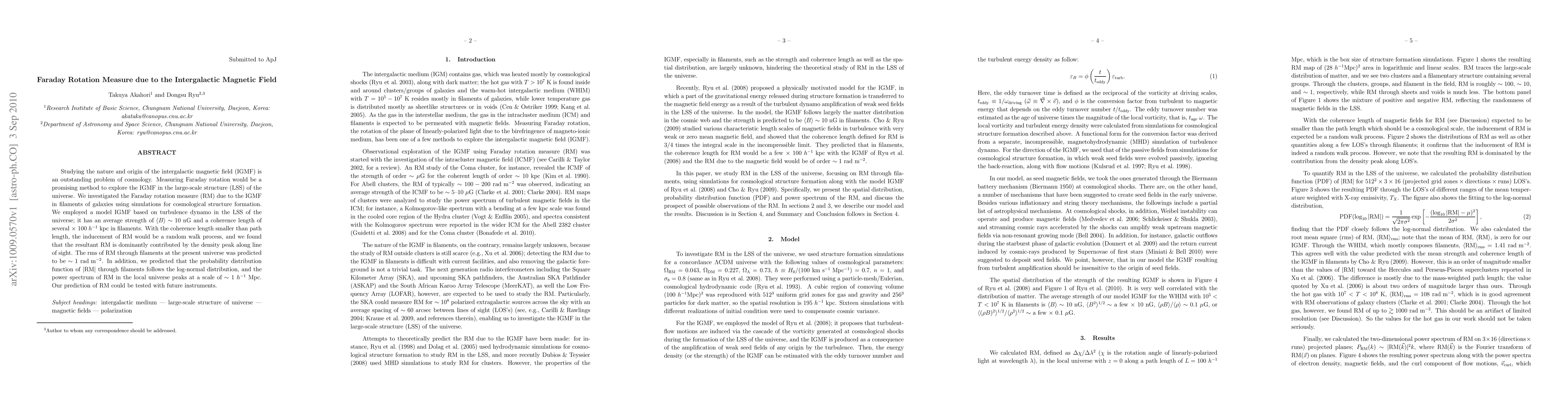 Studying the nature and origin of the intergalactic magnetic field (IGMF) is an outstanding problem of cosmology. Measuring Faraday rotation would be a promising method to explore the IGMF in the large-scale structure (LSS) of the universe. We investigated the Faraday rotation measure (RM) due to the IGMF in filaments of galaxies using simulations for cosmological structure formation. We employed a model IGMF based on turbulence dynamo in the LSS of the universe; it has an average strength of $< B > \sim 10$ nG and a coherence length of several $\times\ 100\ h^{-1}$ kpc in filaments. With the coherence length smaller than path length, the inducement of RM would be a random walk process, and we found that the resultant RM is dominantly contributed by the density peak along line of sight. The rms of RM through filaments at the present universe was predicted to be $\sim 1\ {\rm rad\ m^{-2}}$. In addition, we predicted that the probability distribution function of $|{\rm RM}|$ through filaments follows the log-normal distribution, and the power spectrum of RM in the local universe peaks at a scale of $\sim 1\ h^{-1}$ Mpc. Our prediction of RM could be tested with future instruments.