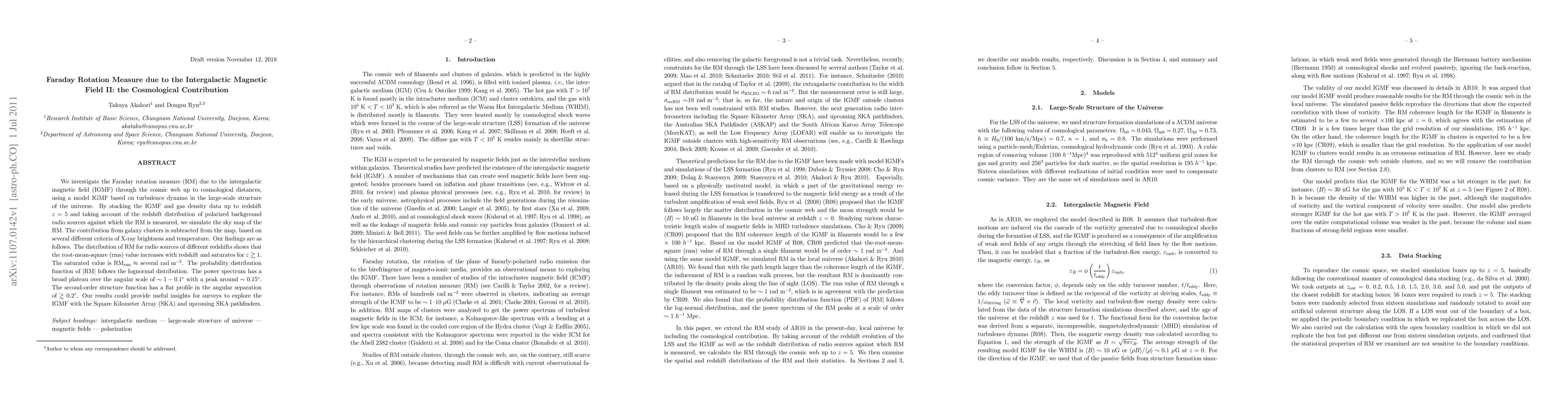 We investigate the Faraday rotation measure (RM) due to the intergalactic magnetic field (IGMF) through the cosmic web up to cosmological distances, using a model IGMF based on turbulence dynamo in the large-scale structure of the universe. By stacking the IGMF and gas density data up to redshift $z=5$ and taking account of the redshift distribution of polarized background radio sources against which the RM is measured, we simulate the sky map of the RM. The contribution from galaxy clusters is subtracted from the map, based on several different criteria of X-ray brightness and temperature. Our findings are as follows. The distribution of RM for radio sources of different redshifts shows that the root-mean-square (rms) value increases with redshift and saturates for $z \ga 1$. The saturated value is RM$_{\rm rms} \approx$ several ${\rm rad m^{-2}}$. The probability distribution function of $|{\rm RM}|$ follows the lognormal distribution. The power spectrum has a broad plateau over the angular scale of $\sim 1 - 0.1^\circ$ with a peak around $\sim 0.15^\circ$. The second-order structure function has a flat profile in the angular separation of $\ga 0.2^\circ$. Our results could provide useful insights for surveys to explore the IGMF with the Square Kilometer Array (SKA) and upcoming SKA pathfinders.