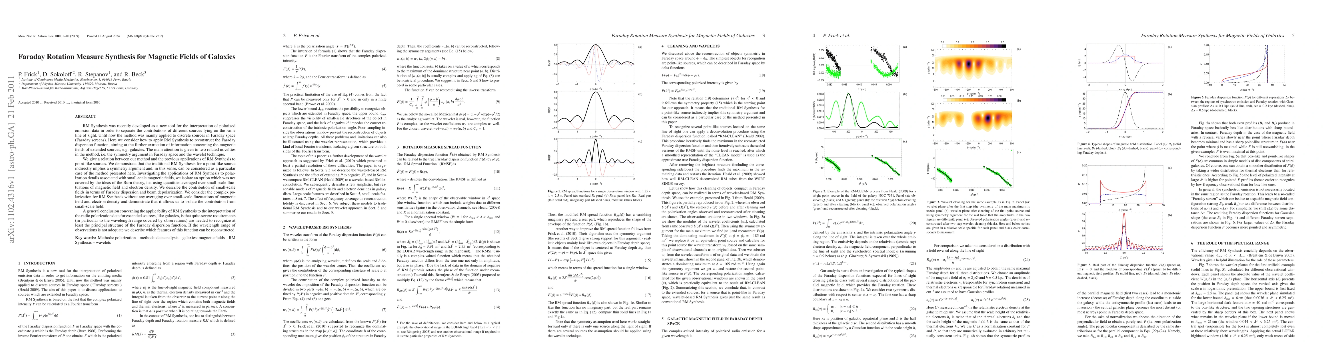 RM Synthesis was recently developed as a new tool for the interpretation of polarized emission data in order to separate the contributions of different sources lying on the same line of sight. Until now the method was mainly applied to discrete sources in Faraday space (Faraday screens). Here we consider how to apply RM Synthesis to reconstruct the Faraday dispersion function, aiming at the further extraction of information concerning the magnetic fields of extended sources, e.g. galaxies. The main attention is given to two related novelties in the method, i.e. the symmetry argument in Faraday space and the wavelet technique. We give a relation between our method and the previous applications of RM Synthesis to point-like sources. We demonstrate that the traditional RM Synthesis for a point-like source indirectly implies a symmetry argument and, in this sense, can be considered as a particular case of the method presented here. Investigating the applications of RM Synthesis to polarization details associated with small-scale magnetic fields, we isolate an option which was not covered by the ideas of the Burn theory, i.e. using quantities averaged over small-scale fluctuations of magnetic field and electron density. We describe the contribution of small-scale fields in terms of Faraday dispersion and beam depolarization. We consider the complex polarization for RM Synthesis without any averaging over small-scale fluctuations of magnetic field and electron density and demonstrate that it allows us to isolate the contribution from small-scale field.