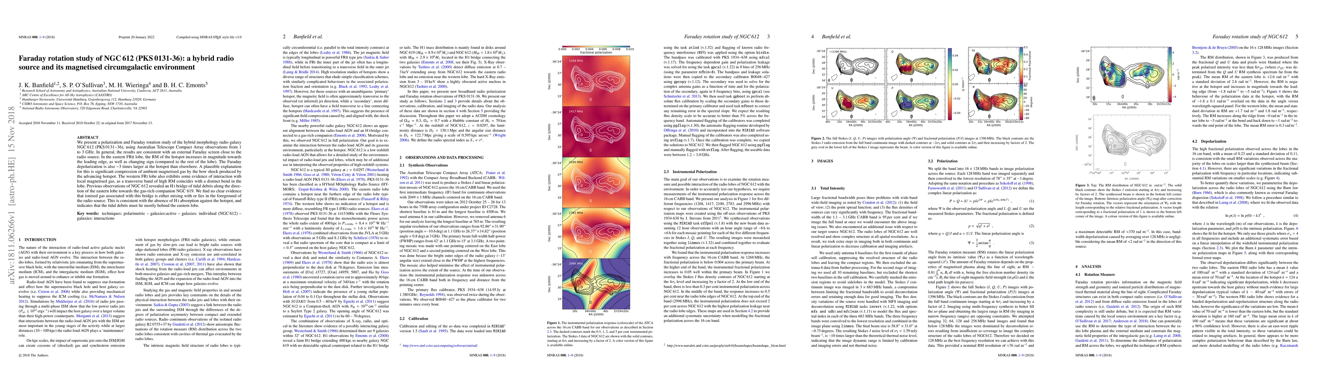 We present a polarization and Faraday rotation study of the hybrid morphology radio galaxy NGC 612 (PKS 0131-36), using Australian Telescope Compact Array observations from 1 to 3 GHz. In general, the results are consistent with an external Faraday screen close to the radio source. In the eastern FRII lobe, the RM of the hotspot increases in magnitude towards the leading edge, as well as changing sign (compared to the rest of the lobe). The Faraday depolarization is also ~3 times larger at the hotspot than elsewhere. A plausible explanation for this is significant compression of ambient magnetised gas by the bow shock produced by the advancing hotspot. The western FRI lobe also exhibits some evidence of interaction with local magnetised gas, as a transverse band of high RM coincides with a distinct bend in the lobe. Previous observations of NGC 612 revealed an HI bridge of tidal debris along the direction of the eastern lobe towards the gas-rich companion NGC 619. We find no clear evidence that ionised gas associated with this bridge is either mixing with or lies in the foreground of the radio source. This is consistent with the absence of HI absorption against the hotspot, and indicates that the tidal debris must lie mostly behind the eastern lobe.