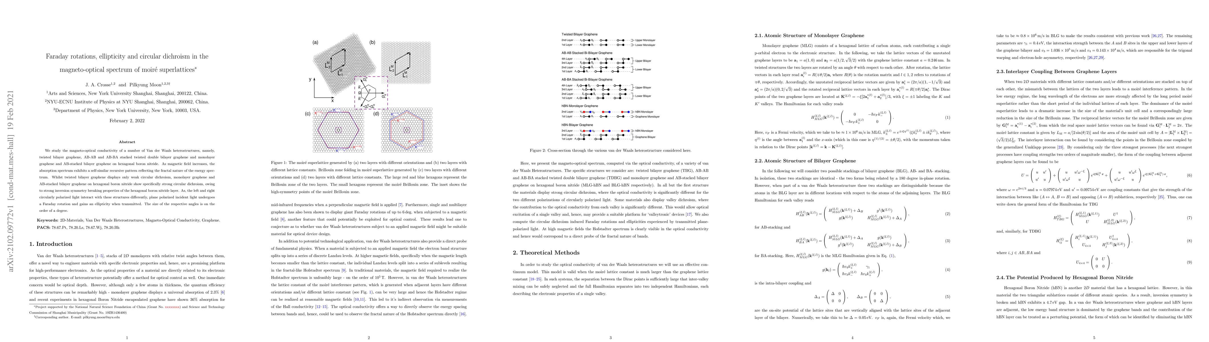 This paper investigates the magneto-optical properties of various Van der Waals heterostructures, revealing that twisted bilayer graphene shows weak circular dichroism while monolayer graphene and AB-stacked bilayer graphene on hexagonal boron nitride exhibit strong circular dichroism due to symmetry breaking. The study finds that plane polarized light undergoes Faraday rotation and ellipticity when passing through these materials, with angles on the order of a degree.
