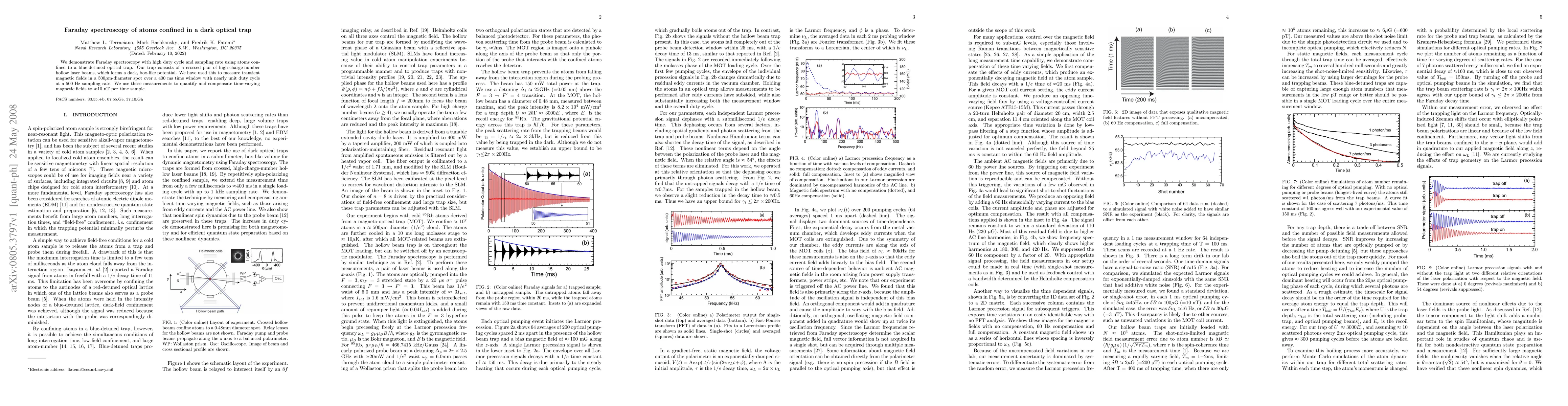 This paper presents Faraday spectroscopy of atoms trapped in a dark optical trap, achieving high duty cycle and sampling rate to measure transient magnetic fields with precision. The method compensates for time-varying magnetic fields to within ~10 nT per sample, demonstrating its effectiveness in magnetic field measurements.