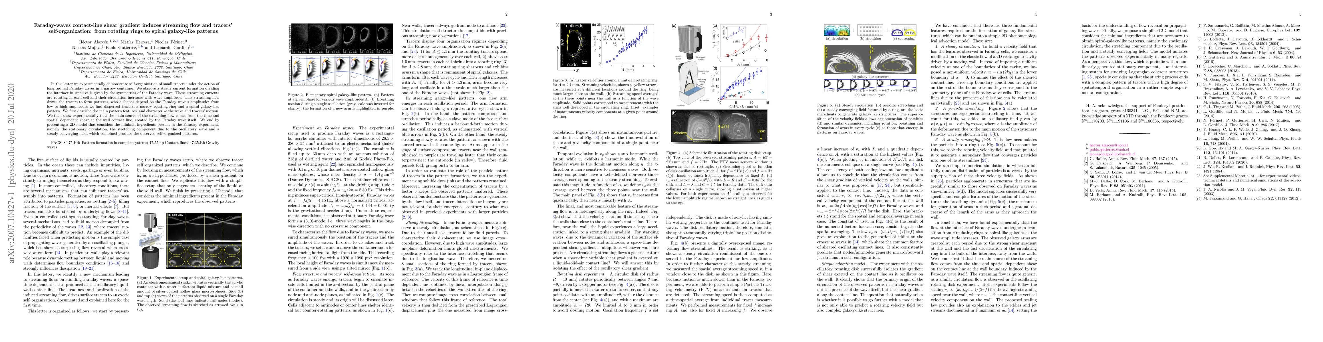 This paper experimentally demonstrates how longitudinal Faraday waves induce self-organization of tracers into patterns ranging from dispersed to spiral galaxy-like shapes, driven by streaming flows originating from shear gradients at the contact line. A 2D model is proposed to explain these phenomena based on circulation, wave-induced stretching, and converging fields.