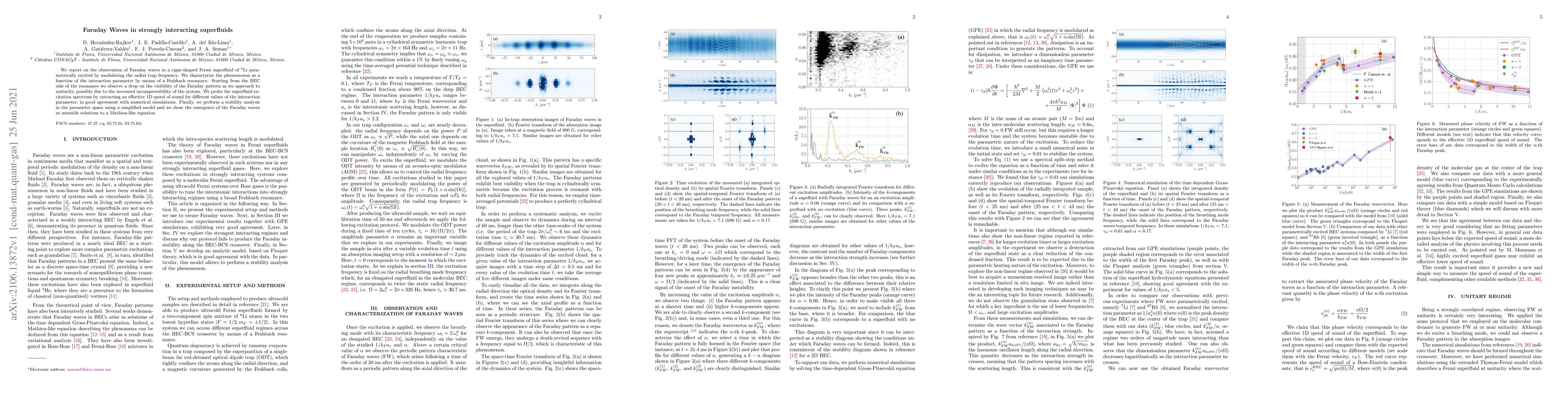 This paper observes Faraday waves in a strongly interacting superfluid of $^6$Li, modulated by changing the radial trap frequency, and finds their visibility drops near unitarity due to increased incompressibility. The study also aligns the extracted effective 1D speed of sound with numerical simulations and demonstrates the emergence of Faraday waves through a stability analysis based on a Mathieu-like equation.