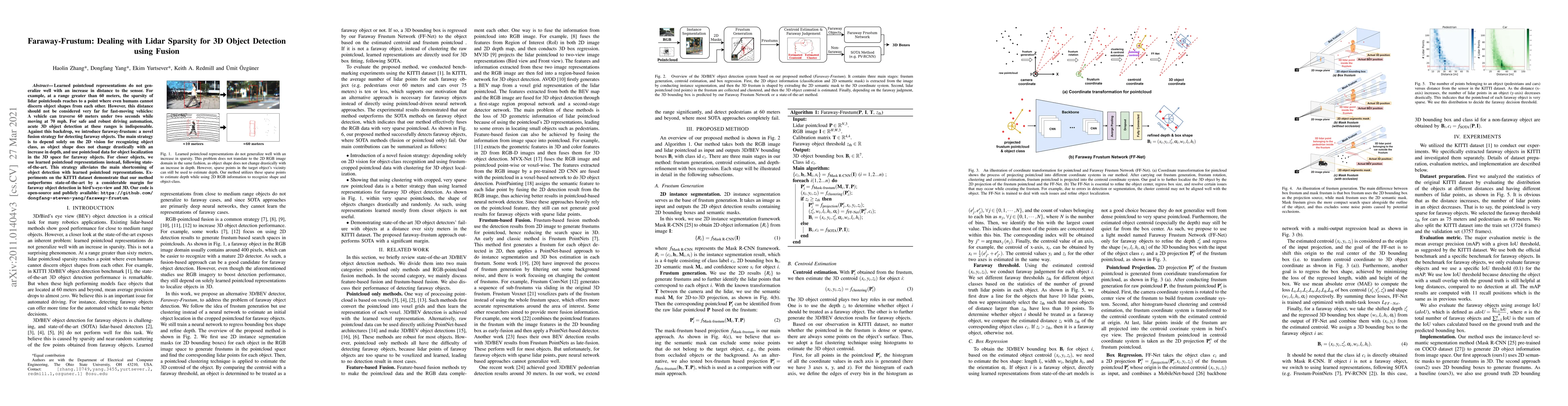 The paper proposes "faraway-frustum," a novel fusion strategy to address lidar sparsity for 3D object detection at long ranges, using 2D vision for object classification and pointcloud data for localization. This method outperforms state-of-the-art on the KITTI dataset for detecting faraway objects.