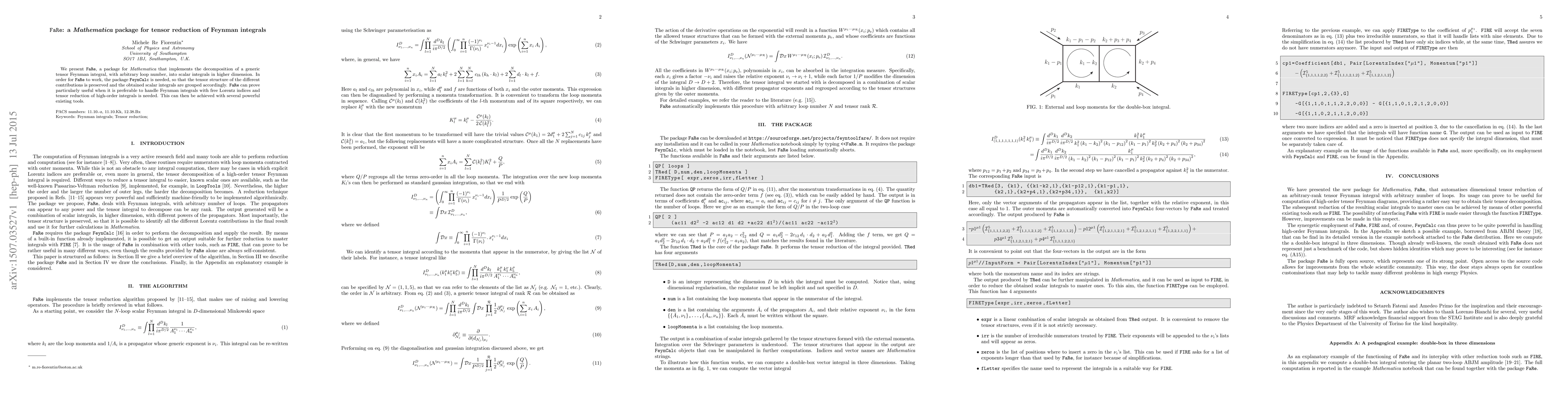 FaRe is a Mathematica package designed to decompose tensor Feynman integrals into scalar integrals in higher dimensions, utilizing the FeynCalc package to maintain tensor structure. It is particularly useful for handling high-order integrals with free Lorentz indices.