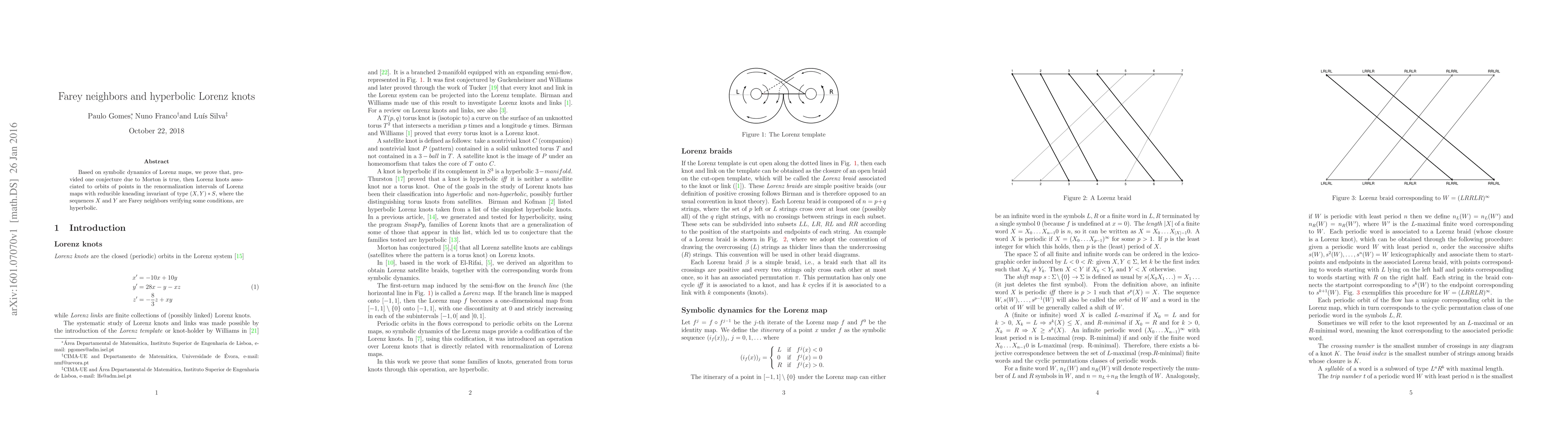 This paper proves that Lorenz knots linked to orbits of points in renormalization intervals of Lorenz maps, where the kneading invariants are reducible and sequences X and Y are Farey neighbors, are hyperbolic, assuming Morton's conjecture holds true.