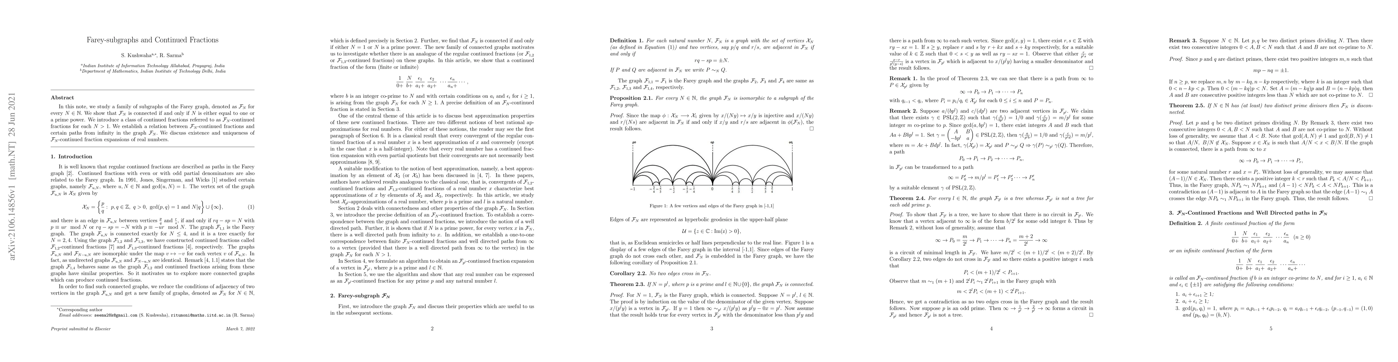 This paper investigates subgraphs $\mathcal{F}_N$ of the Farey graph, proving they are connected if $N=1$ or $N$ is a prime power. It introduces $\mathcal{F}_N$-continued fractions, linking them to specific paths in $\mathcal{F}_N$ and discusses their existence and uniqueness for real numbers.