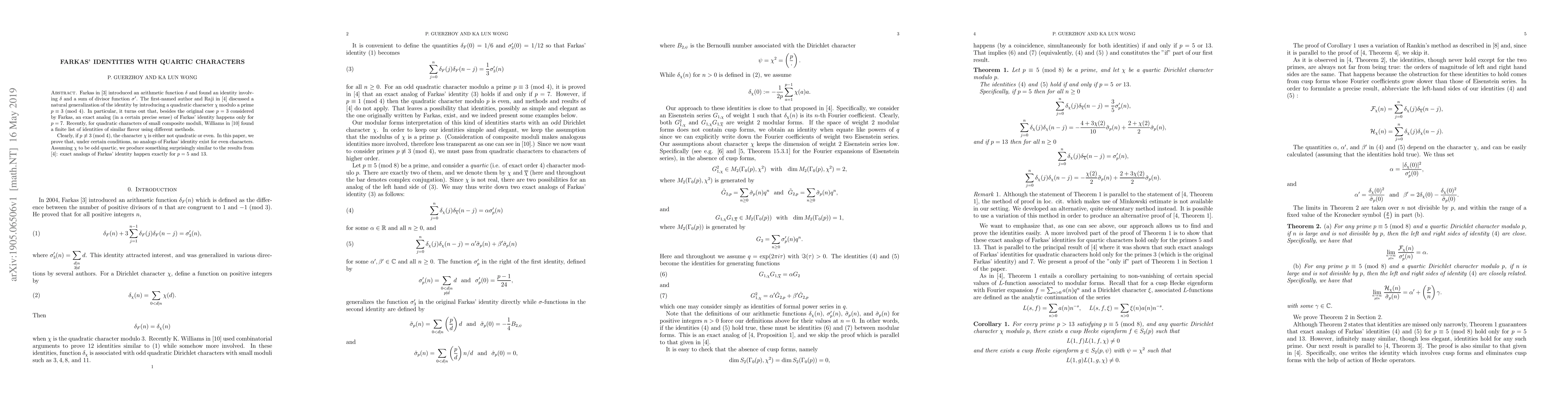 This paper explores generalizations of Farkas' identities involving quartic characters, proving that no analogs exist for even characters. It finds exact analogs of Farkas' identity for odd quartic characters only when the prime modulus is $p=5$ or $p=13$.