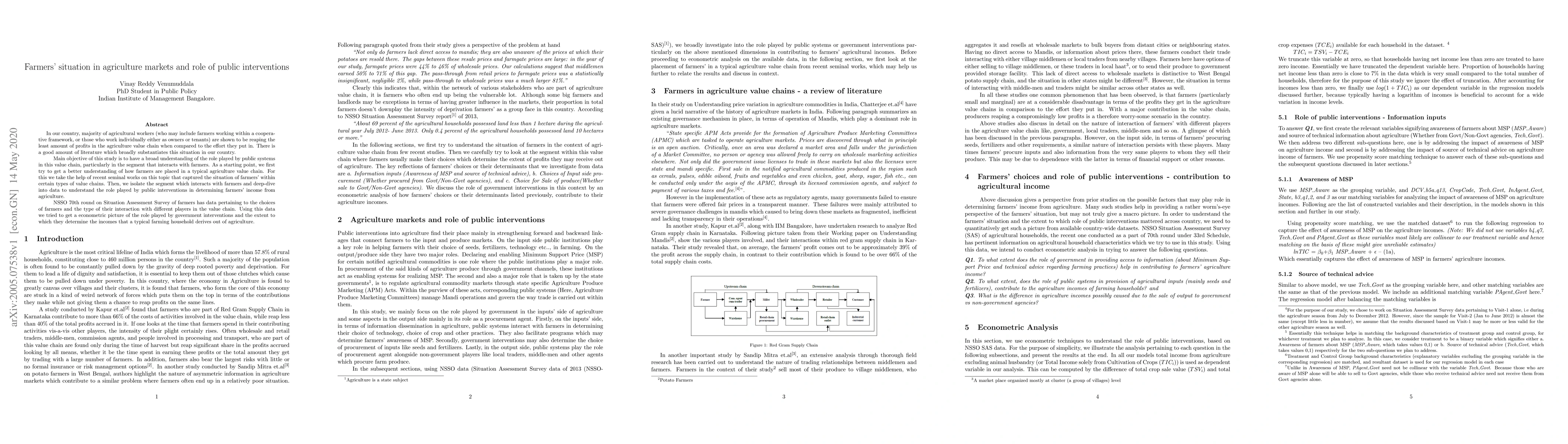 This study examines the low profitability of farmers in India's agriculture value chain and investigates the role of public interventions in enhancing farmers' incomes. Using NSSO data, it analyzes the impact of government interventions on farmers' agricultural income.