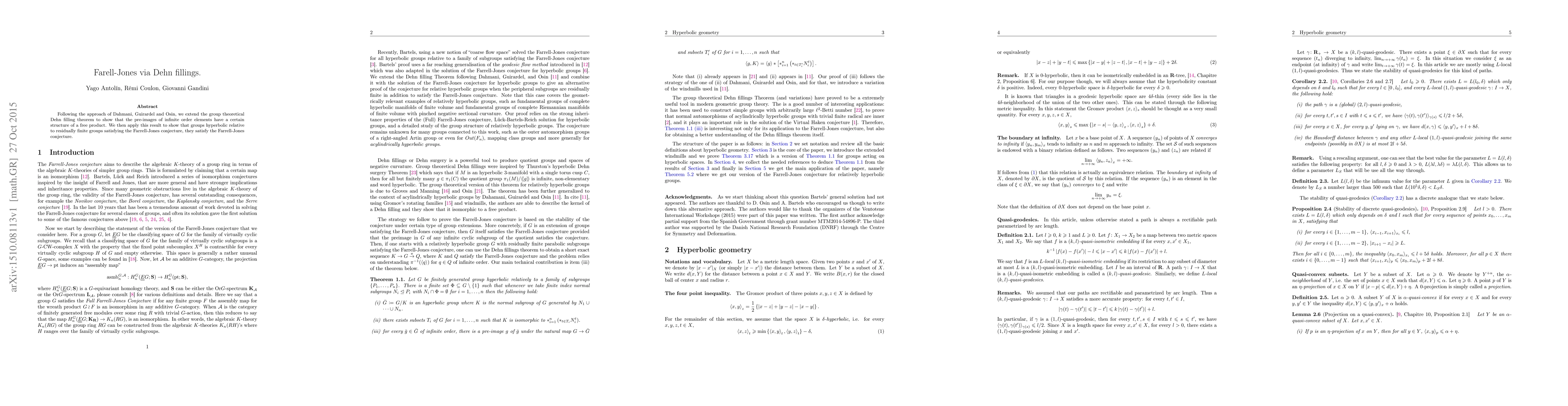 Summary: This paper extends the group theoretical Dehn filling theorem to demonstrate that pre-images of infinite order elements have a free product structure. It further applies this result to show that groups hyperbolic relative to residually finite groups fulfilling the Farrell-Jones conjecture also satisfy the conjecture.
