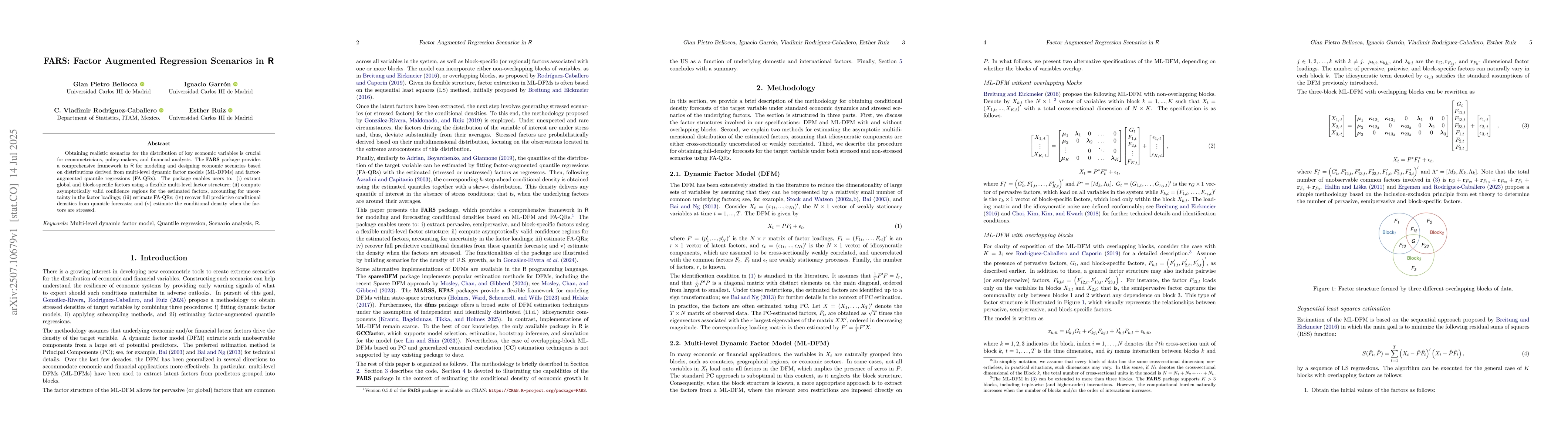 Obtaining realistic scenarios for the distribution of key economic variables is crucial for econometricians, policy-makers, and financial analysts. The FARS package provides a comprehensive framework in R for modeling and designing economic scenarios based on distributions derived from multi-level dynamic factor models (ML-DFMs) and factor-augmented quantile regressions (FA-QRs). The package enables users to: (i) extract global and block-specific factors using a flexible multi-level factor structure; (ii) compute asymptotically valid confidence regions for the estimated factors, accounting for uncertainty in the factor loadings; (iii) estimate FA-QRs; (iv) recover full predictive conditional densities from quantile forecasts; and (v) estimate the conditional density when the factors are stressed.