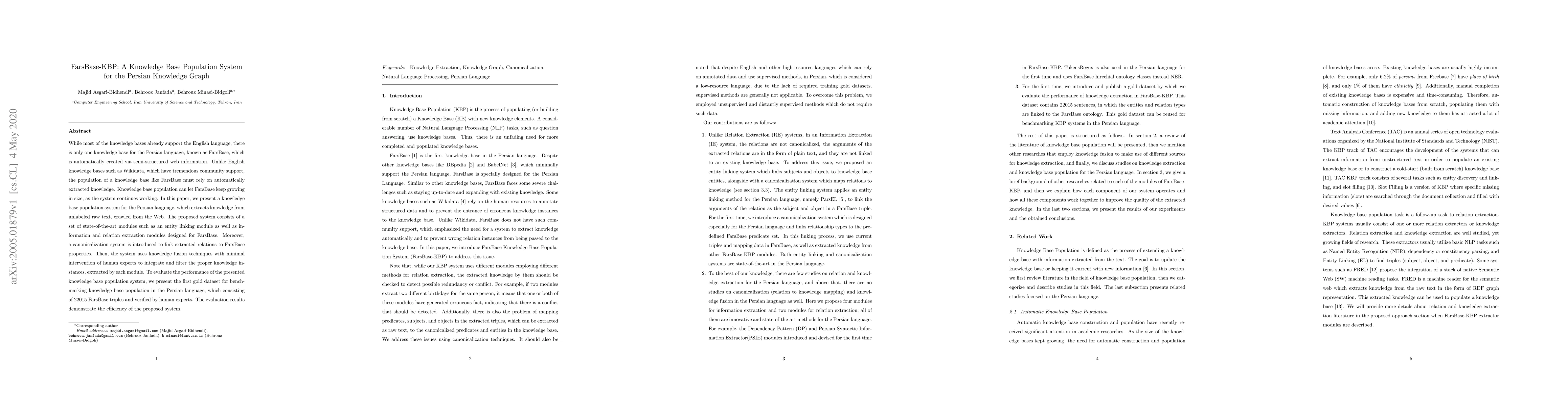 This paper introduces FarsBase-KBP, a system for populating the Persian knowledge base FarsBase by extracting knowledge from unlabeled web text. The system includes modules for entity linking, information extraction, and relation extraction, along with a canonicalization system to link extracted relations to FarsBase properties, and a knowledge fusion technique for minimal human intervention. Evaluation using a newly created gold dataset shows the system's efficiency.