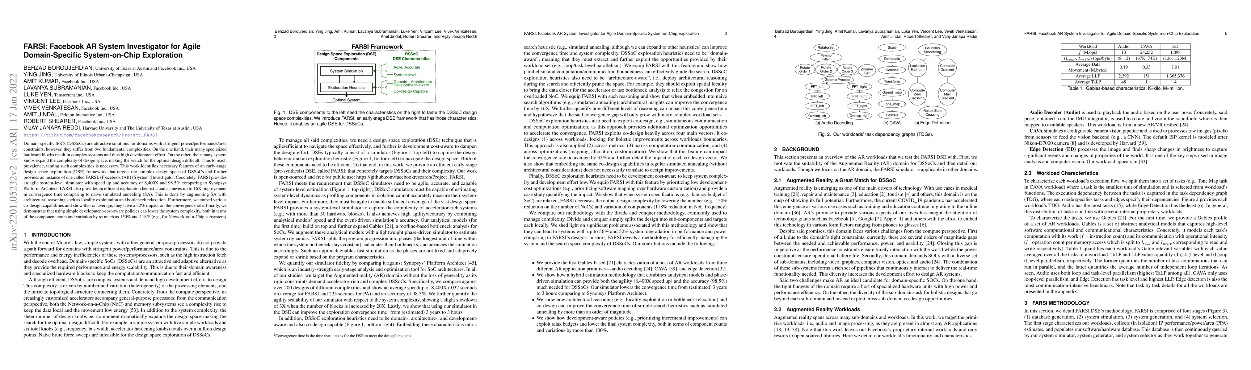 The research introduces FARSI, a system-on-chip exploration framework for domain-specific SoCs. FARSI offers an 8,400X faster and 98.5% accurate simulator than Synopsys Platform Architect. It improves convergence time by 16X using architectural reasoning in its exploration heuristic. FARSI also demonstrates co-design capabilities impacting convergence rate by 32%, on average. Simple development-cost-aware policies can reduce system complexity by up to 150% and 118%.