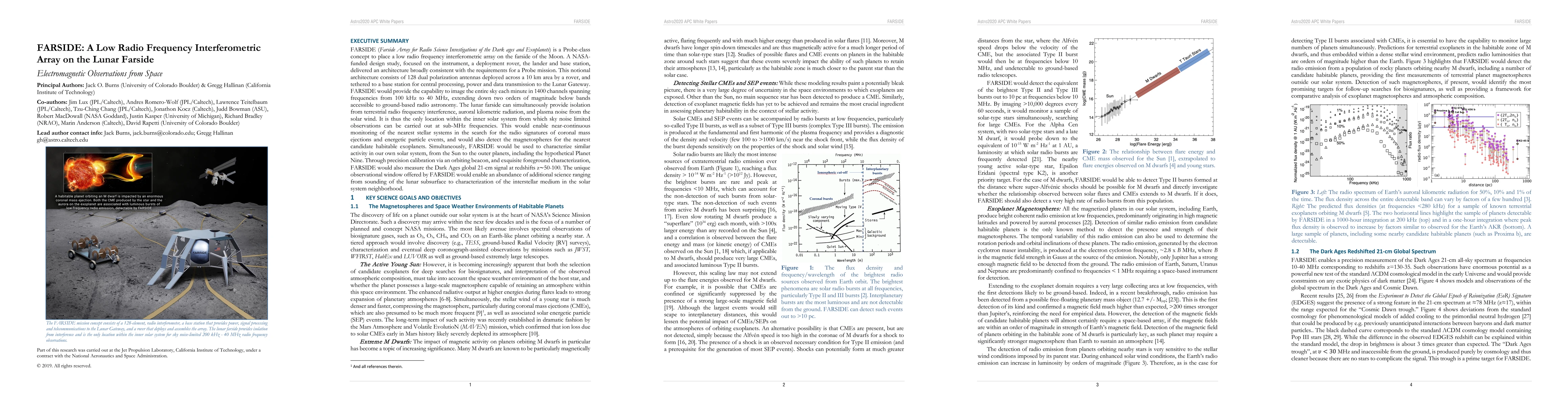 FARSIDE is a proposed low radio frequency interferometric array on the Moon's farside, designed to detect radio signals from the Dark Ages and exoplanets while minimizing terrestrial interference. It aims to image the sky in 1400 channels from 100 kHz to 40 MHz and study solar system activity and the 21-cm signal.