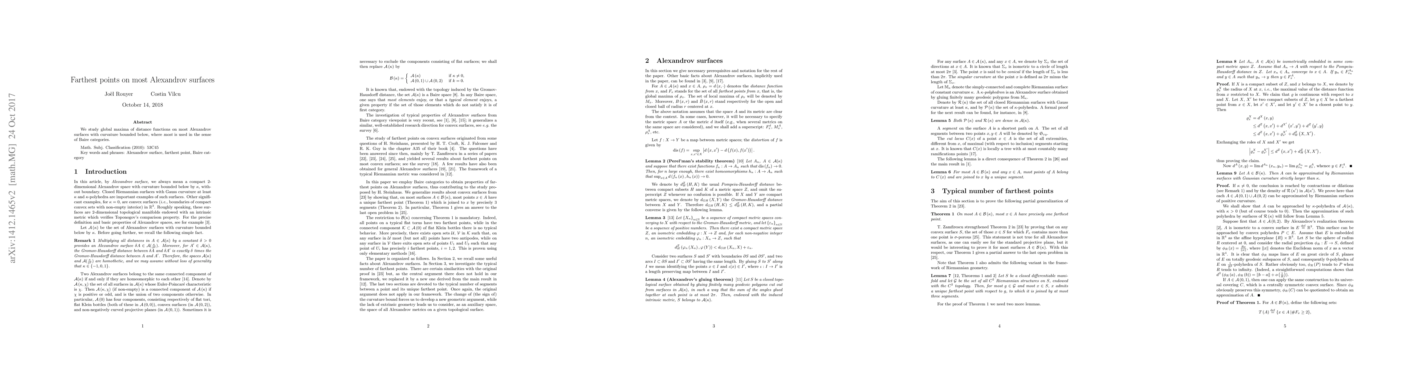 Summary: This paper investigates the global maxima of distance functions on Alexandrov surfaces with positive curvature, focusing on the majority of such surfaces in the Baire category sense. The study aims to understand the geometric properties of these surfaces through their farthest points.